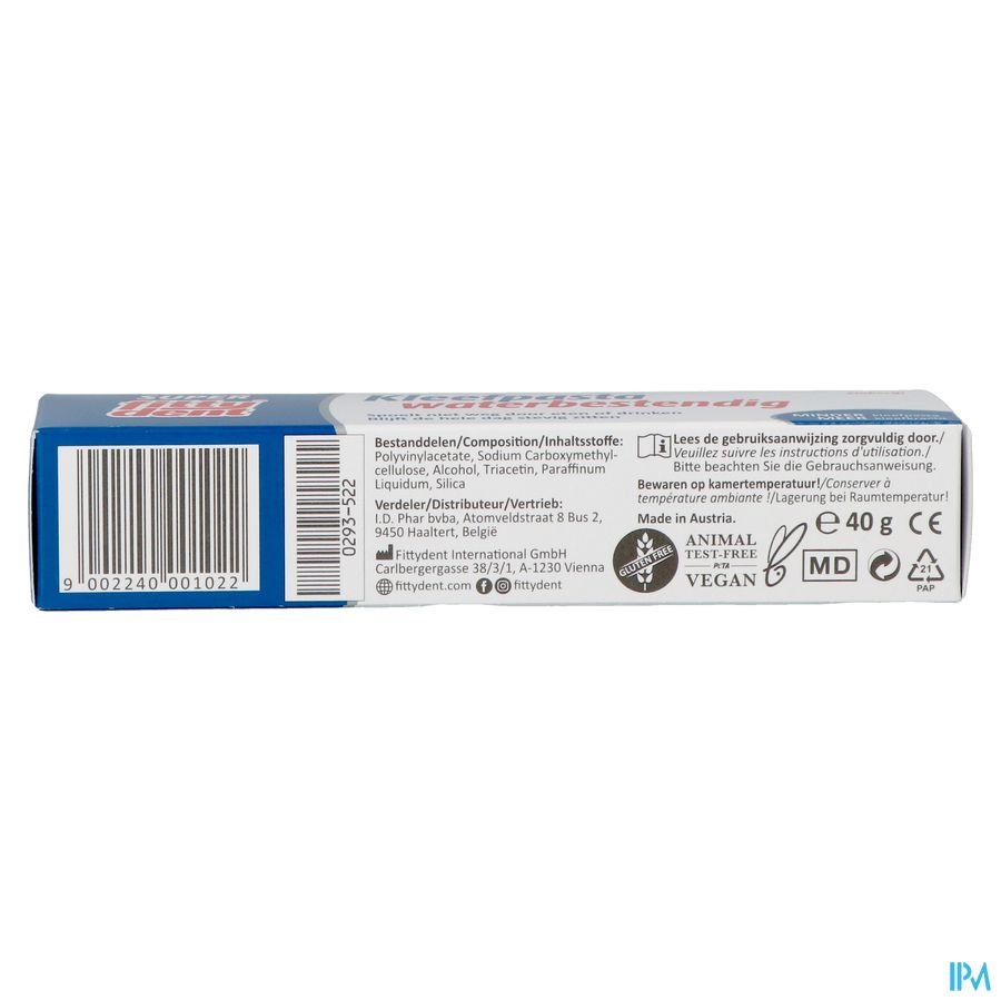 Fittydent Kleefpasta is de enige prothese lijm wereldwijd die waterbestendig is, waardoor deze niet gaat schuiven tijdens het eten en drinken. Het zorgt voor een zeer sterke hechting, zodat de prothese de hele dag goed blijft bevestigd aan het tandvlees. Fittydent Kleefpasta geeft u de vrijheid en het vertrouwen om de hele dag vrijuit te spreken en te lachen en om te eten en te drinken zonder zorgen of schaamte.