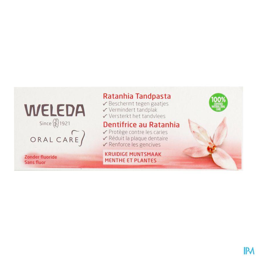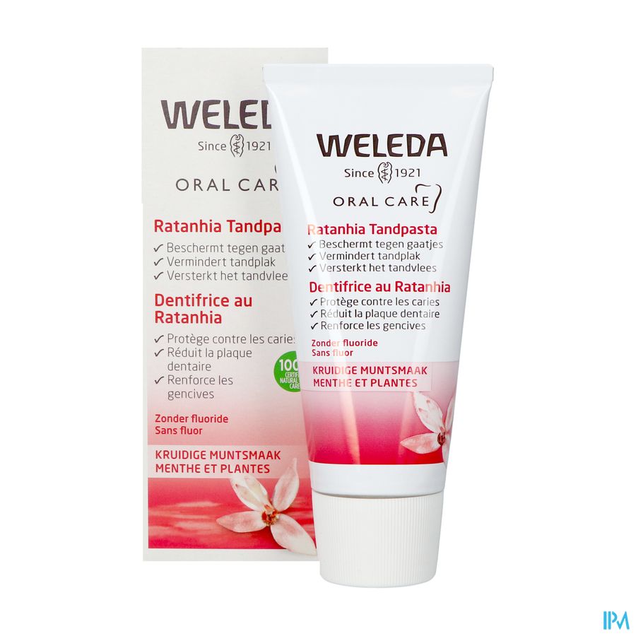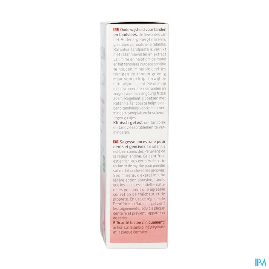 Ratanhia Tandpasta maakt het tandvlees sterk en stevig en trekt het samen rond de tandwortel. Bij goed poetsen met Ratanhia Tandpasta krijgt tandplak geen kans. Als het tandvlees rood en gevoelig is, werken Ratanhia en mirre zuiverend. Aan de tandpasta zijn geen fluoride en synthetische schuimmiddelen toegevoegd.