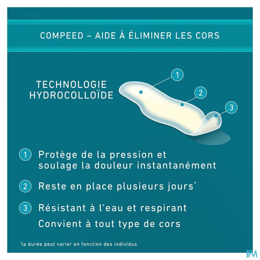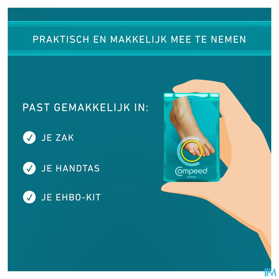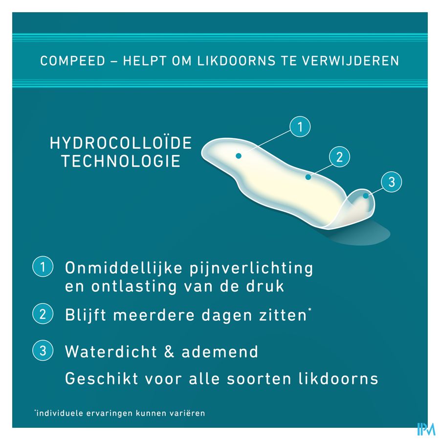 Met de likdoornpleisters van Compeed® kan je de likdoorn beschermen tegen druk en wrijving. Dit neemt de pijn weg en zorgt ervoor dat de likdoorn niet verder aangroeit. Door de hydrocolloïdgel worden de harde huidlagen zachter en kunnen ze gemakkelijk verwijderd worden. De pleisters kunnen ook gebruikt worden om likdoorns te voorkomen.