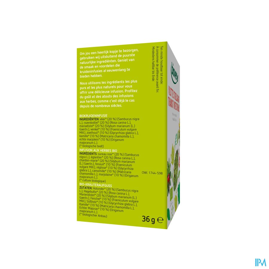 Vlier* (20 %) (Sambucus nigra L.), rozenbottel* (20 %) (Rosa canina L.), mariadistel* (20 %) (Silybum marianum (L.) Gaertn.), venkel* (10 %) (Foeniculum vulgare Mill.), zoethout* (10 %) (Glycyrrhiza glabra L.), kamille* (10 %) (Matricaria chamomilla L.), echte marjolein* (10 %) (Origanum majoranum L.). (* biologische teelt)