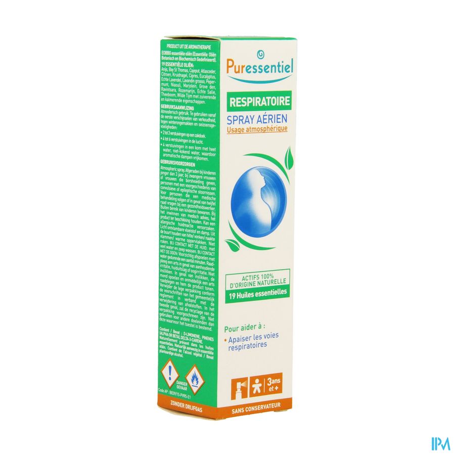 De 19 essentiële oliën van de Spray ademhaling zijn ideaal om de luchtwegen te helpen vrijmaken, te zuiveren en te verzachten en om de kwaaltjes te verlichten die optreden bij weersveranderingen of tijdens allergieperioden.Deze spray mag worden gebruikt om te verstuiven in de lucht, op uw zakdoek of op uw hoofdkussen of in een kom water om te inhaleren.Hij helpt de secreties vloeibaarder te maken waardoor u gemakkelijker uw neus kunt snuiten en hij ontsmet en verzacht uw luchtwegen.Hij helpt de microben te verdrijven, te zuiveren en uw luchtwegen te verzorgen.Deze uiterst fijne verstuiving is niet-irriterend voor de huid.
