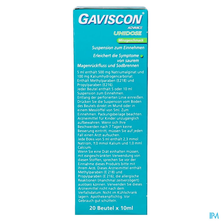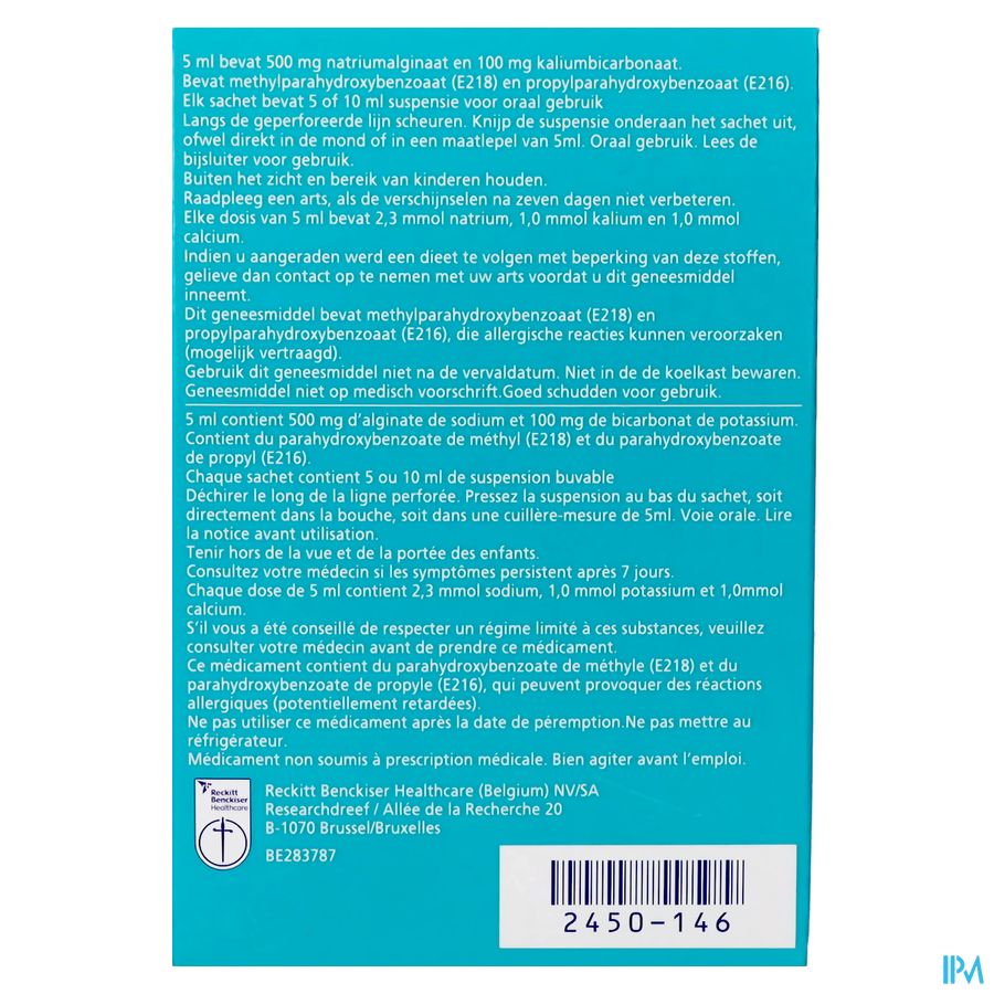 De werkzame stoffen in dit middel zijn 500 mg natriumalginaat en 100 mg kaliumbicarbonaat per 5 ml suspensie voor oraal gebruik. De andere stoffen in dit middel zijn calciumcarbonaat, carbomeer, methylparahydroxybenzoaat (E218), propylparahydroxybenzoaat (E216), natriumsaccharinaat, pepermuntaroma en gezuiverd water.