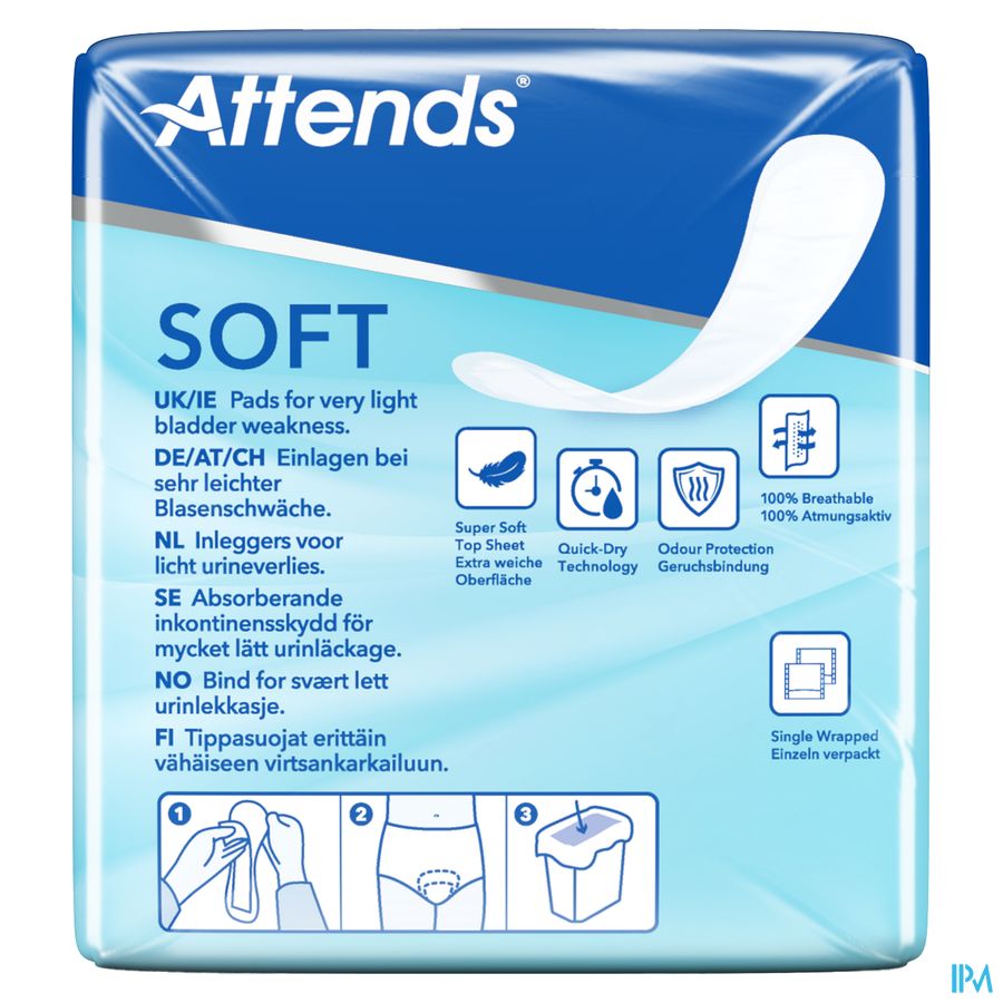 Alle Attends Soft inleggers hebben een luchtdoorlatende, zachte buitenlaag die aanvoelt als zacht textiel. Deze bevordert de gezondheid van de huid en het gevoel van comfort. Dankzij de fixtatiestrip blijft de inlegger op zijn plaats om zo risico op lekkage uit te sluiten. Attends Soft 1 tot en met 3 zijn per stuk verpakt vanuit hygiënisch oogpunt en gemakkelijk mee te nemen als u niet thuis bent. Probeer de nieuwe Attends Soft en ervaar het gevoel van comfort en veiligheid.
