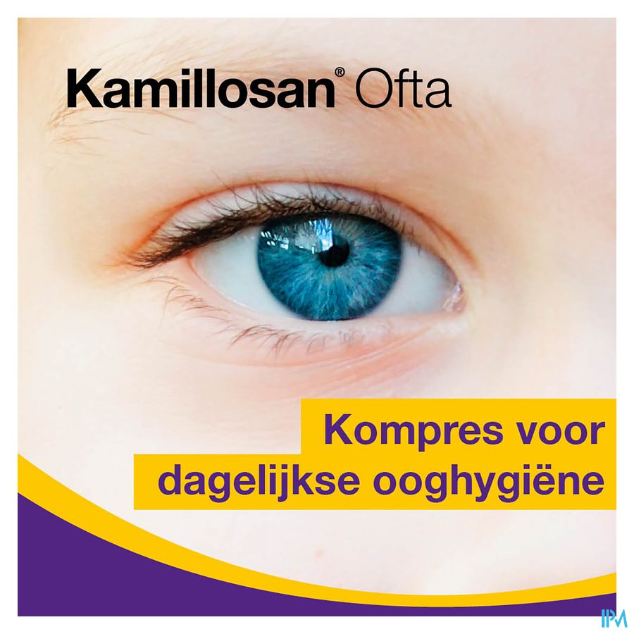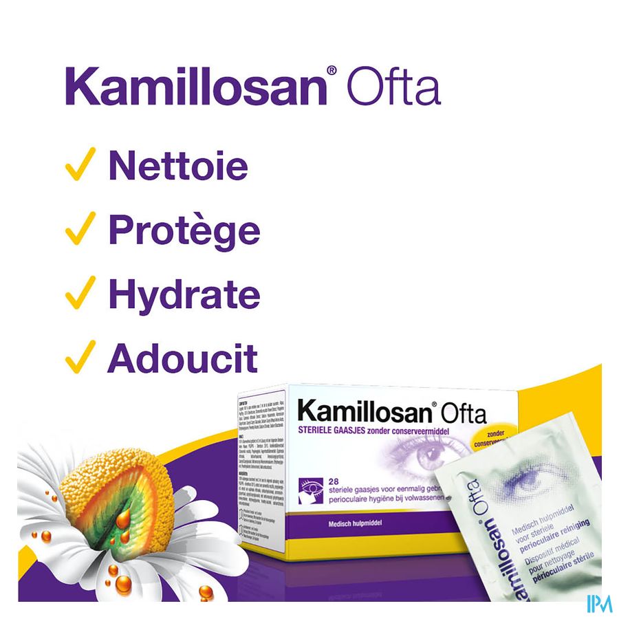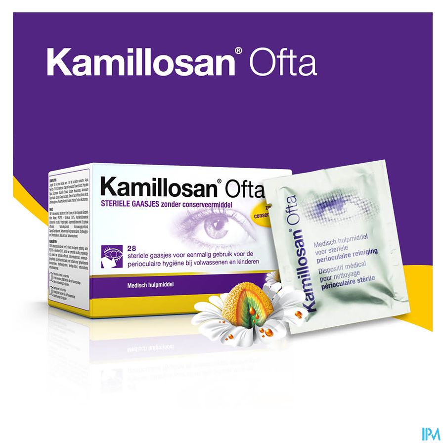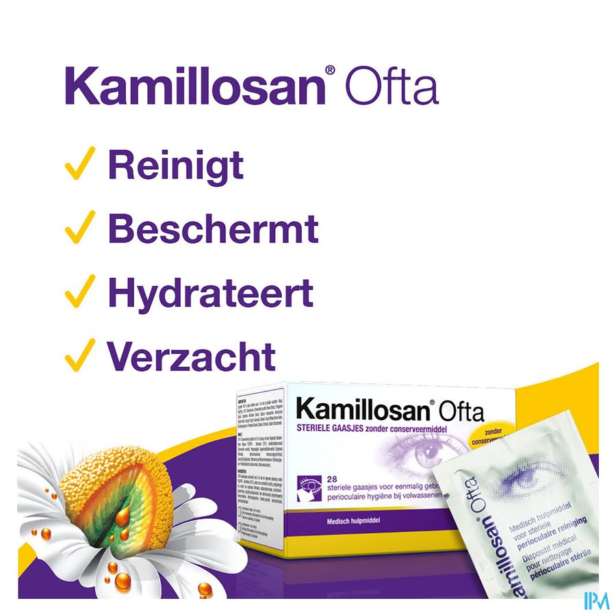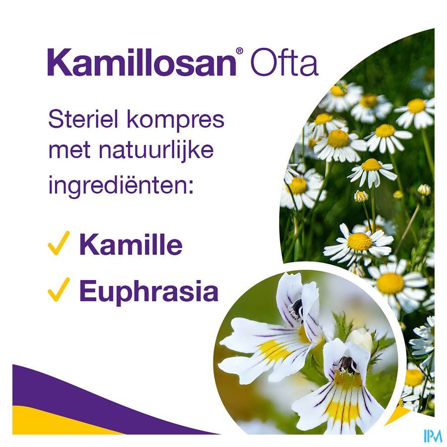 Kamillosan Ofta bestaat uit katoengaas dat doordrenkt is met een oplossing van plantaardige extracten (Chamomilla Recutita, Euphrasia Officinalis) en hyaluronzuur met zuiverende, kalmerende, ontzwelende, hydraterende en beschermende werking.