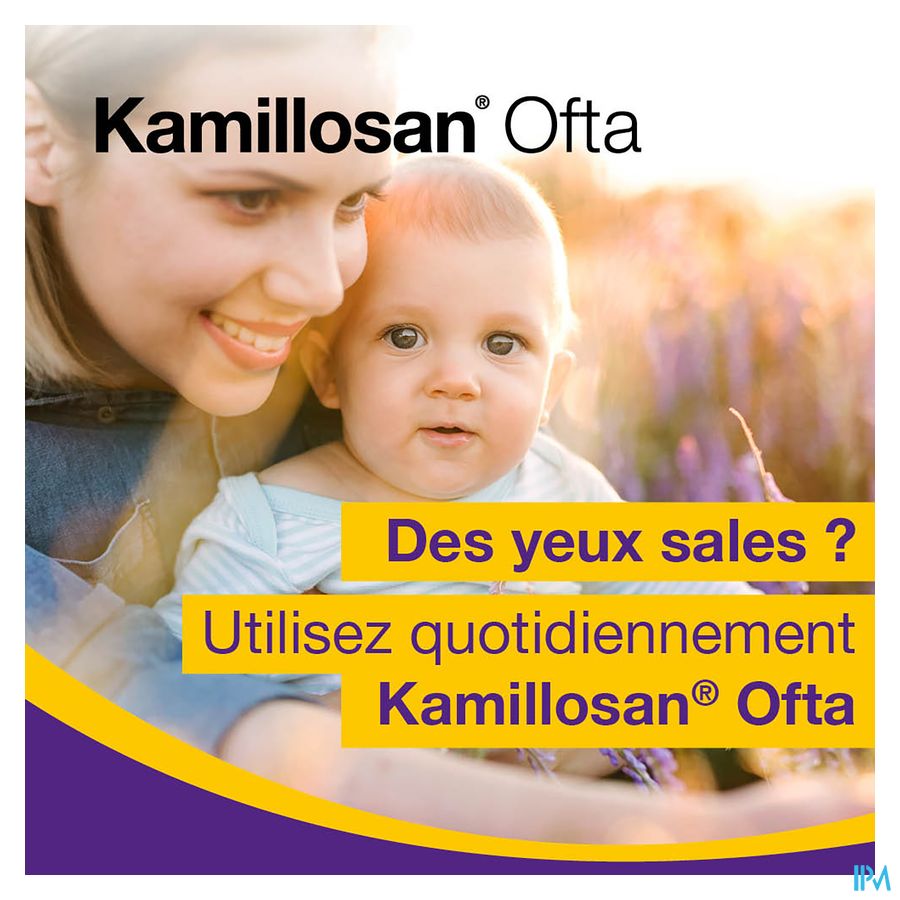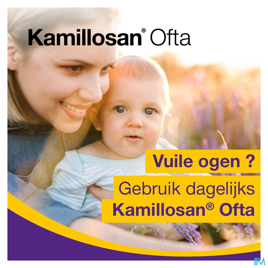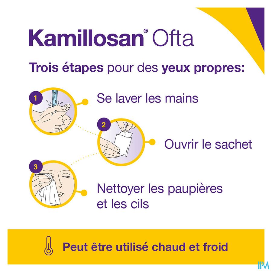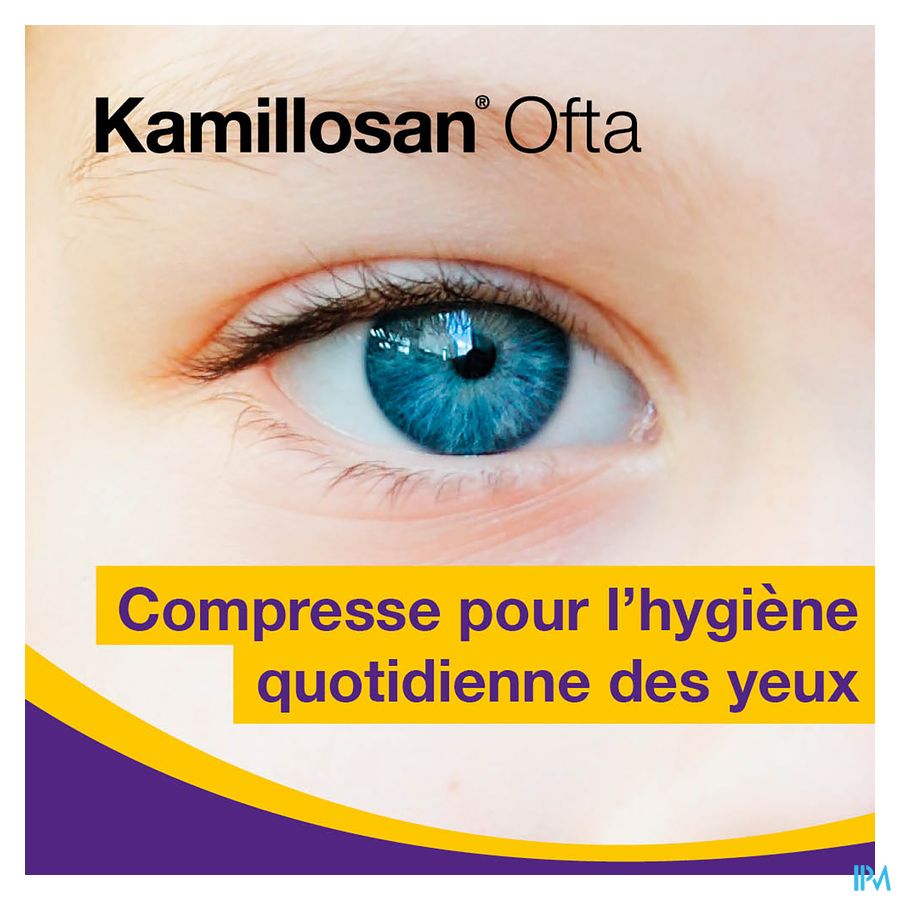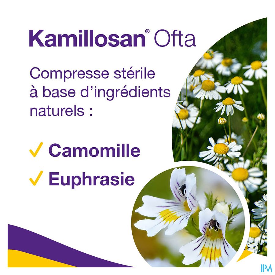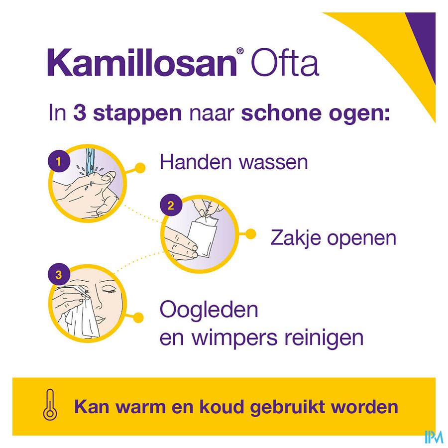 Kamillosan Ofta bestaat uit katoengaas dat doordrenkt is met een oplossing van plantaardige extracten (Chamomilla Recutita, Euphrasia Officinalis) en hyaluronzuur met zuiverende, kalmerende, ontzwelende, hydraterende en beschermende werking.