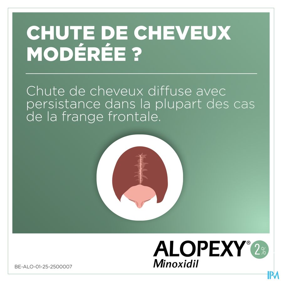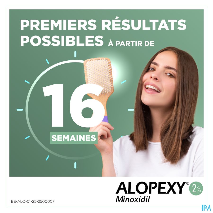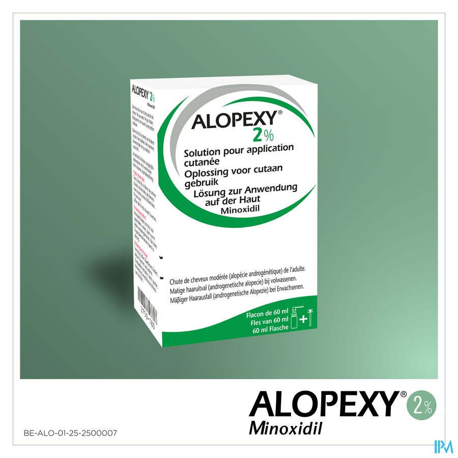 Alopexy is een oplossing voor cutaan gebruik die bestaat uit minoxidil 2%, de werkzame stof, 96% ethanol, propyleenglycol, gamma-cyclodextrine en gezuiverd water.