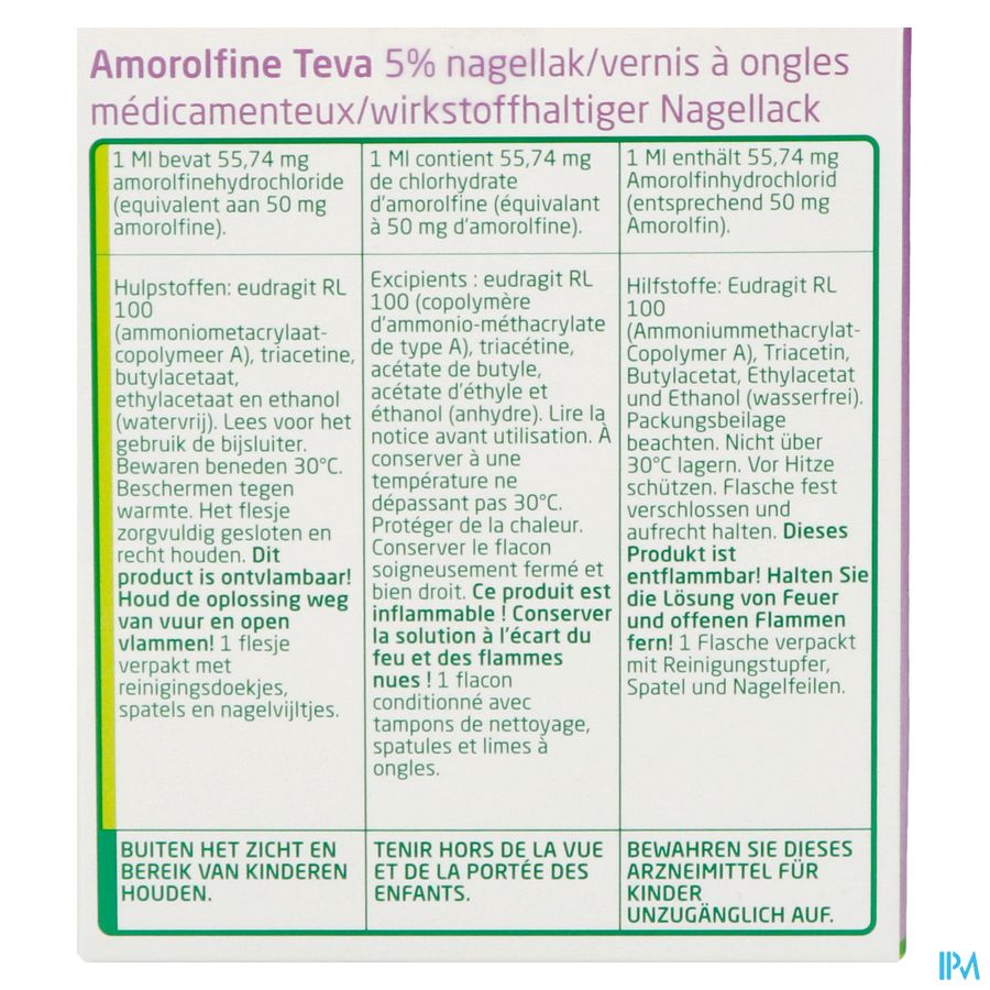 De werkzame stof in dit middel is amorolfine. Amorolfine Teva bevat 50 mg/ml van de werkzame stof amorolfine (equivalent aan 55,74 mg/ml amorolfinehydrochloride).