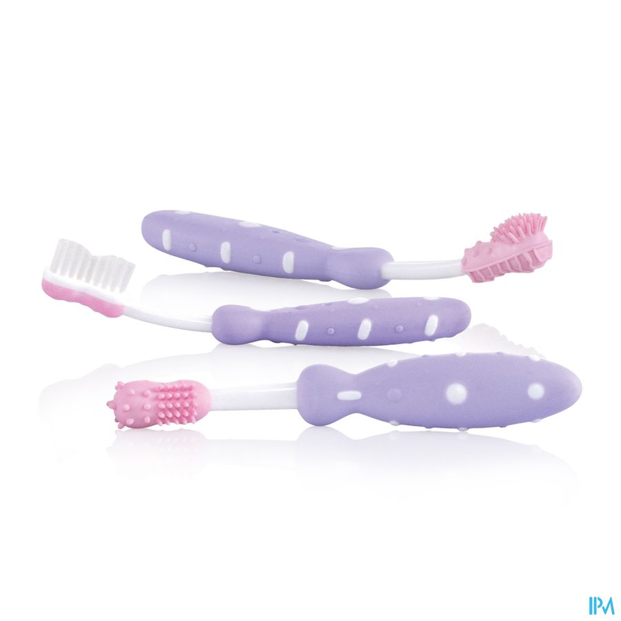 Met deze tandenborstelset met 3 verschillende tandenborsteltjes is een gezonde orale ontwikkeling bij je baby verzekerd. Het is van groot belang om die eerste belangrijke melktandjes goed te beschermen. De set voorziet één tandenborstel per groeifase en is dus helemaal ontworpen in functie van de ontwikkeling van je kindje.