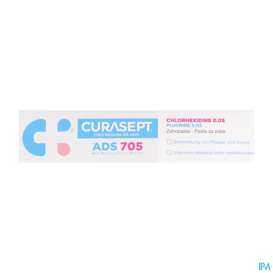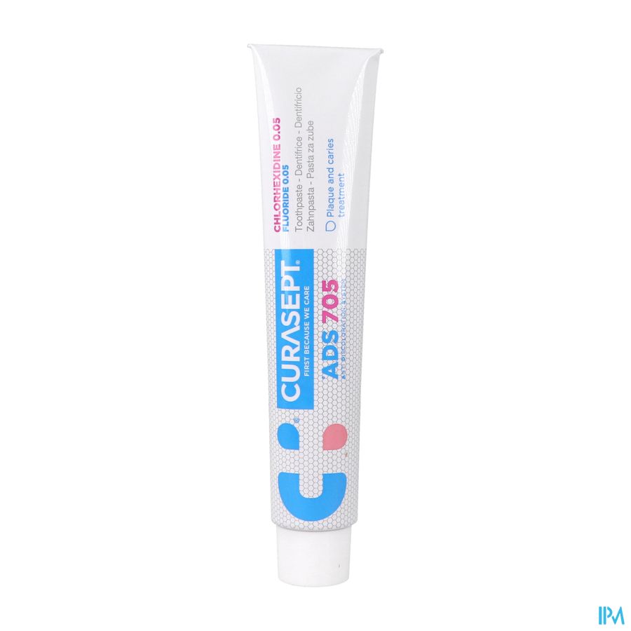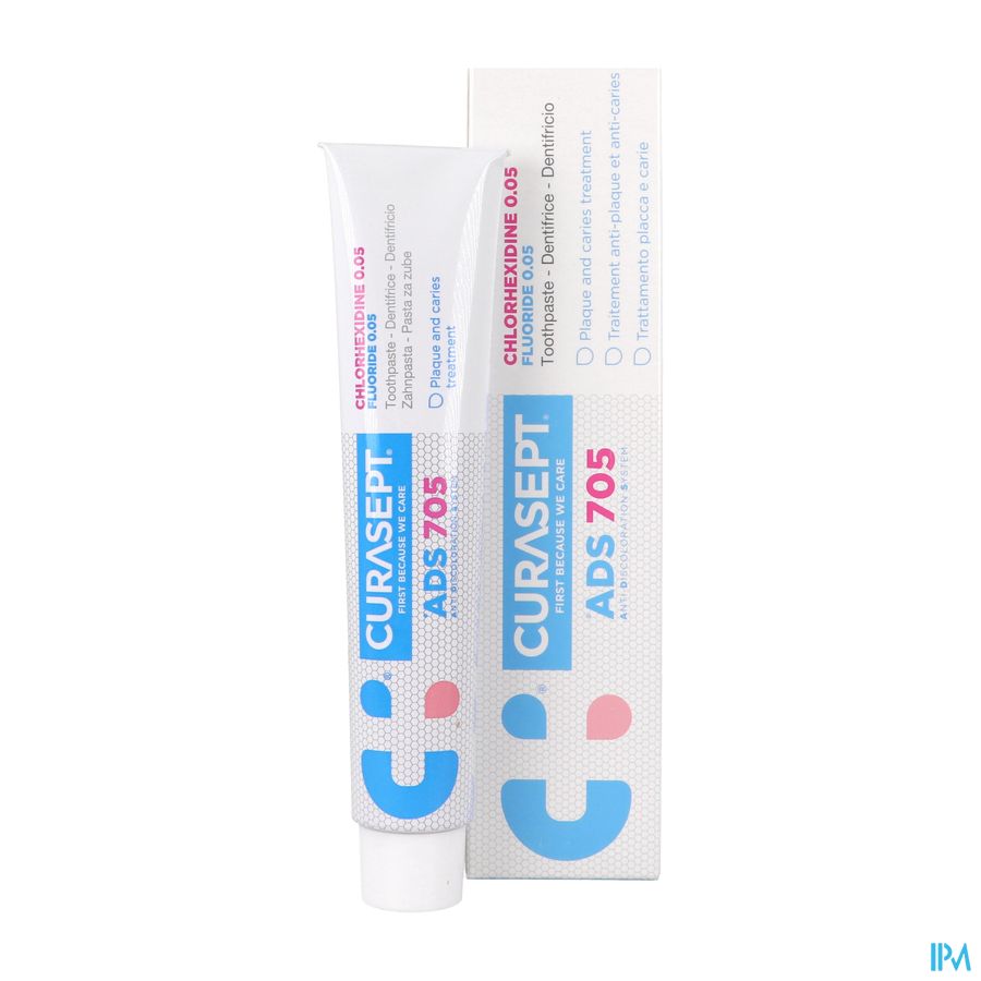 Curasept ADS 705 Gel-Tandpasta 0.05% CHX is een unieke gel-tandpasta voor langdurig gebruik op basis van 0.05% chloorhexidine (CHX), 0.05% natriumfluoride en het innovatieve en gepatenteerde Anti Discoloration System (ADS). Dit systeem vermindert het ontstaan van tandverkleuringen en smaakverlies door de twee chemische reacties die leiden tot pigmentatie (verkleuringen) af te remmen, zonder hierbij de anti-plak werking in de weg te zitten. Bovendien geniet u dankzij de afwezigheid van alcohol van een irritatievrije poetsbeurt zonder branderig gevoel na afloop.
