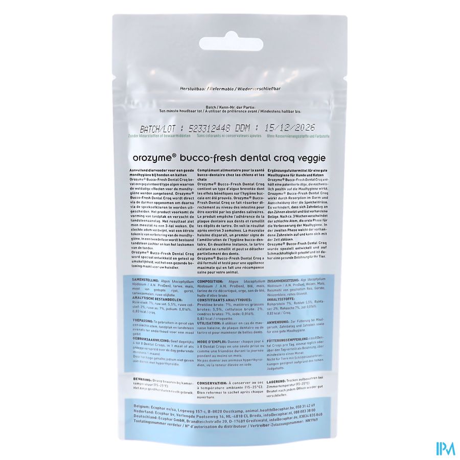 Orozyme Bucco Fresh Dental Croqs is een 100% natuurlijk aanvullend diervoeder op basis van een speciaal type algen. Deze algen zijn ook terug te vinden in . De Dental Croqs verhinderen dat tandplak zich vastzet op de tanden en verweekt de aanslag. Orozyme Bucco Fresh PlaqueOff