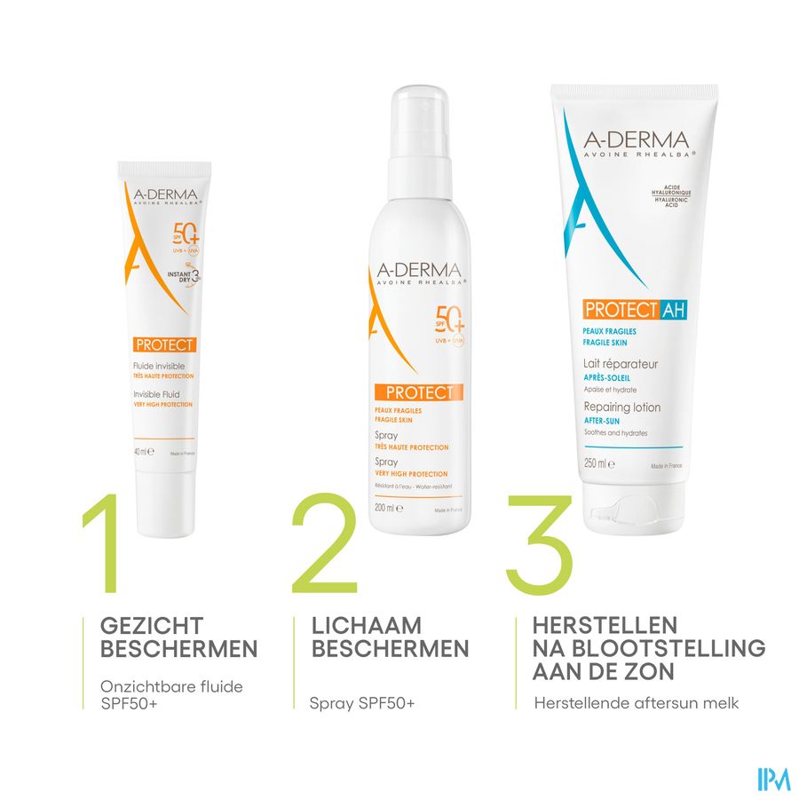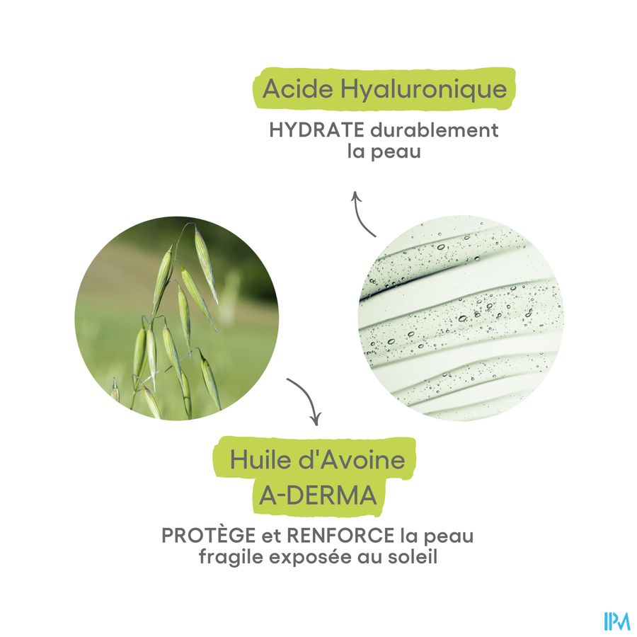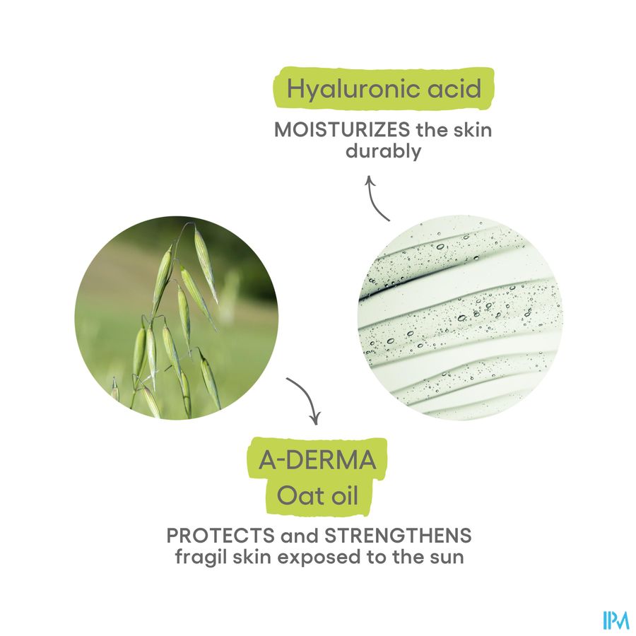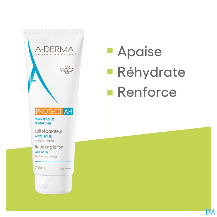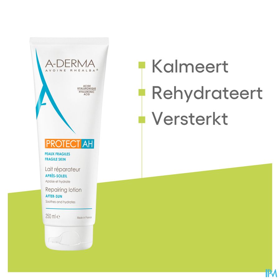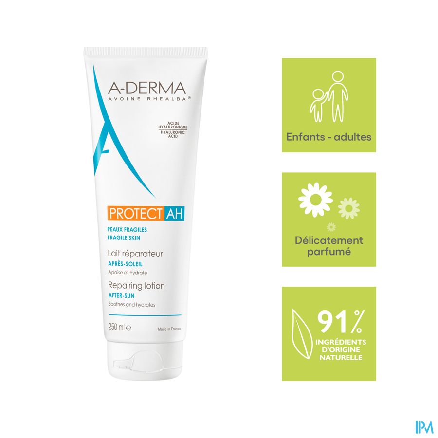 Deze herstellende aftersunmelk biedt de fragiele, gevoelige huid van het hele gezin een hydraterende aftersunmelk die speciaal is samengesteld om aan hun behoeften te voldoen. De innoverende samenstelling rehydrateert en kalmeert onmiddellijk de verhitte huid. Door de combinatie van twee essentiële actieve bestanddelen, hyaluronzuur (hydraterend bestanddeel) en Rhealba® haverkiemolie, bevordert A-DERMA PROTECT AH Hydraterende Herstellende Aftersun Melk het herstel van de epidermis. Hyaluronzuur gaat het vochtverlies door blootstelling aan de zon tegen en Rhealba® Haverkiemolie gaat de vertraagde oxidatieve effecten tegen (want zelfs na blootstelling blijven de cellulaire aanvallen aanhouden). Deze licht geparfumeerde en ultrafrisse melk kan zowel op het gezicht als op het lichaam worden aangebracht dankzij de frisse en lichte formule die voor 91% uit ingrediënten van natuurlijke oorsprong bestaat. De tere, gevoelige huid wordt gekalmeerd, gehydrateerd en beschermd. Rhealba® haver van biologische teelt. Vegan Info: zonder ingrediënten van dierlijke oorsprong