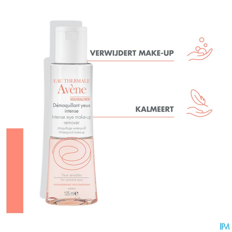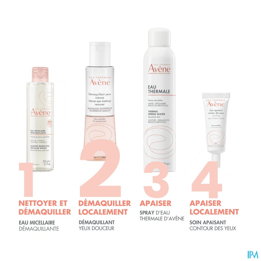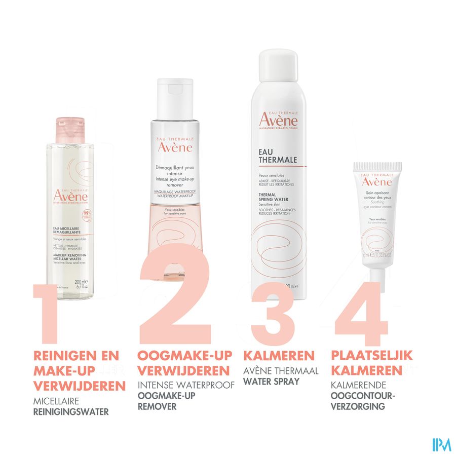 • VERWIJDERT MAKE-UP : verwijdert langhoudende, intense en waterproof make-up. • KALMEERT : één van de eigenschappen van het Thermaal Water van Avène. • ZONDER SPOELEN : biedt een niet-vettige finish.