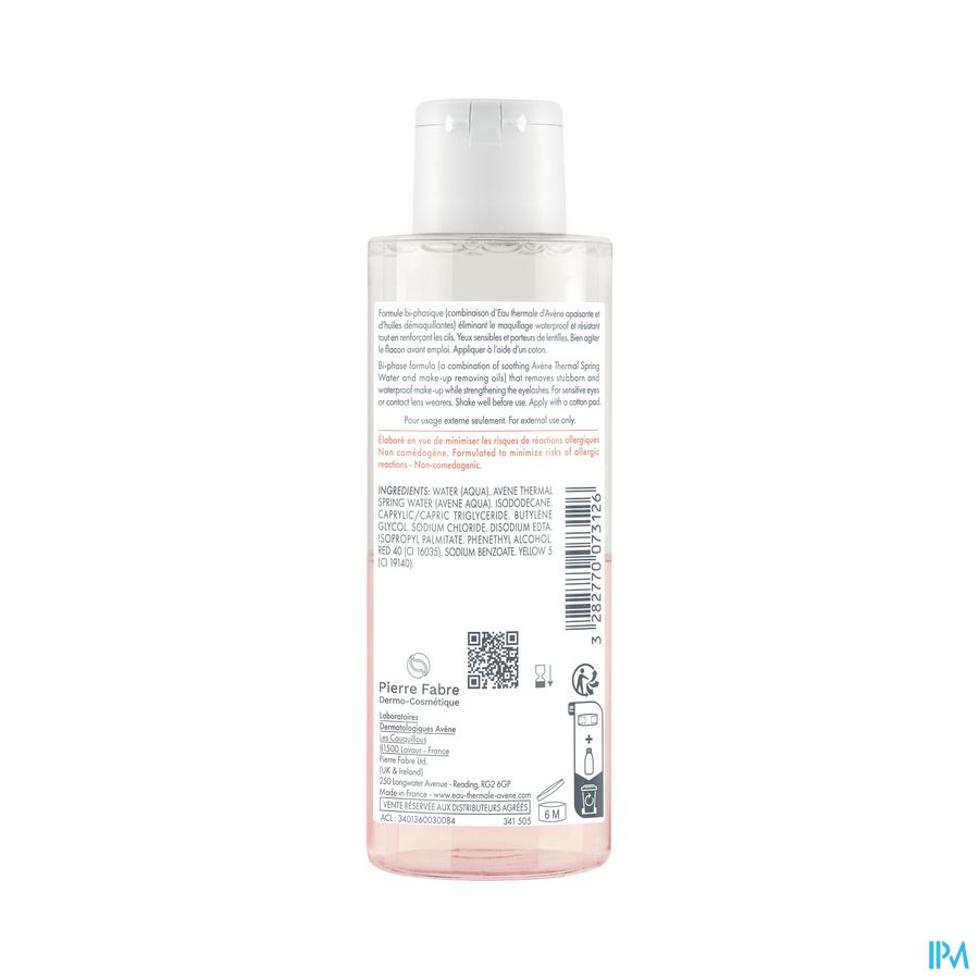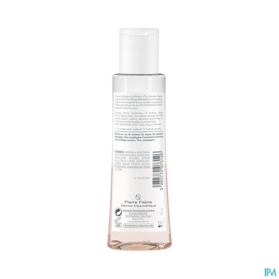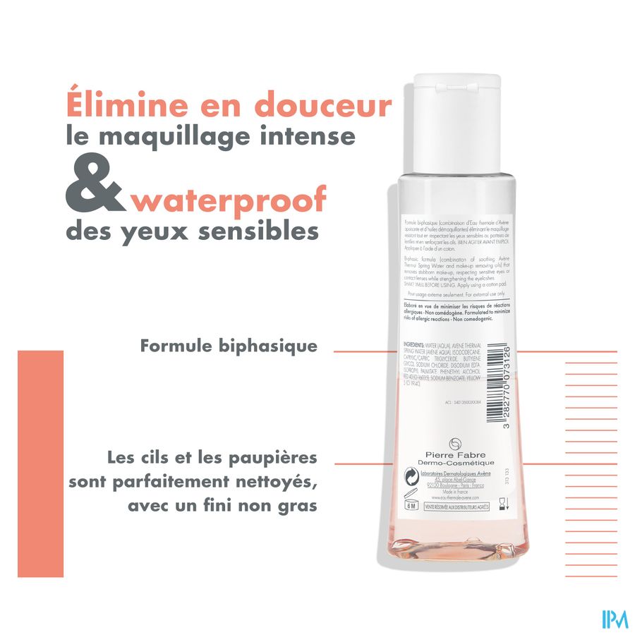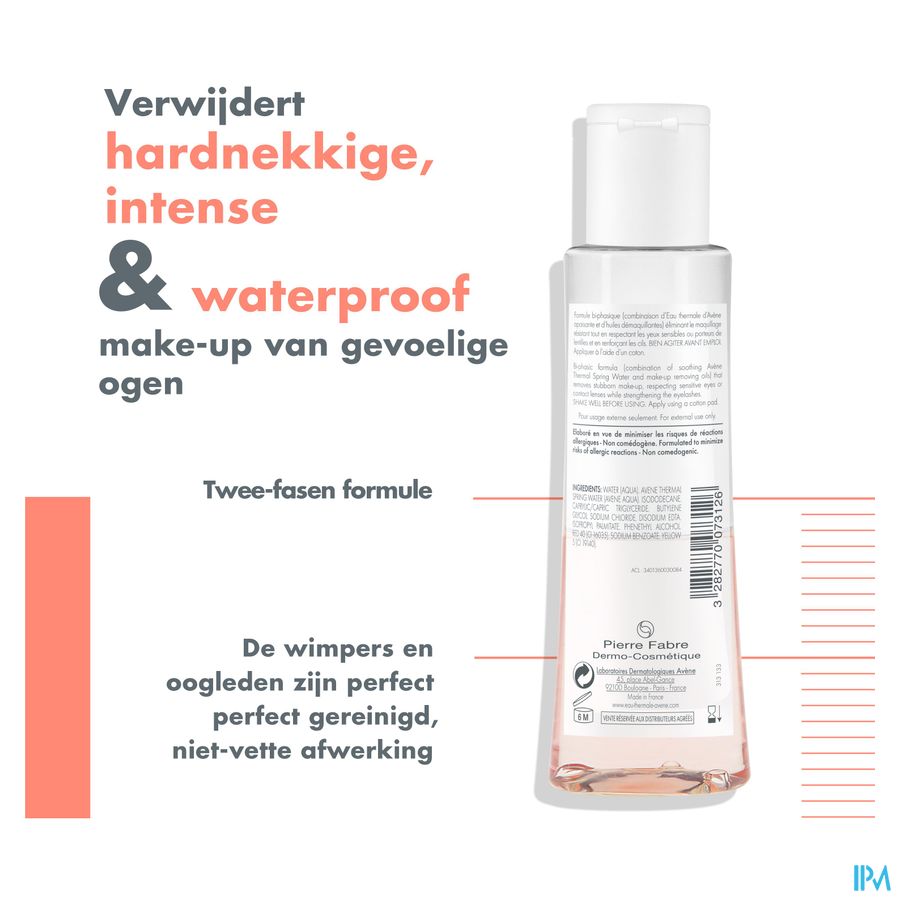 De tweefasen formule (een combinatie van verzachtend Thermaal Water van Avène en oliën die make-up helpen te verwijderen) en de isotone concentratie zorgen ervoor dat de huid efficiënte en comfortabele wijze ontdaan wordt van make-up. Deze intensieve oogmake-upremover voor gevoelige ogen is perfect geschikt voor mensen die contactlenzen dragen en verwijdert langhoudende, intense en waterproof make-up. De formule reinigt de wimpers en oogleden perfect en laat geen vettig laagje achter op de huid.