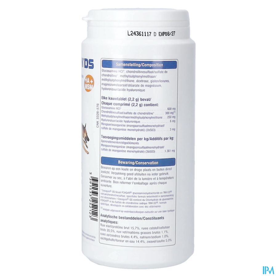 Samenstelling per tablet: Glucosamine hydrochloride (HCl) 600 mg, chondroitinesulfaat (FCHG49) 300 mg, methylsulphonylmethaan 250 mg, hyaluronzuur 6 mg en mangaan 3mg.