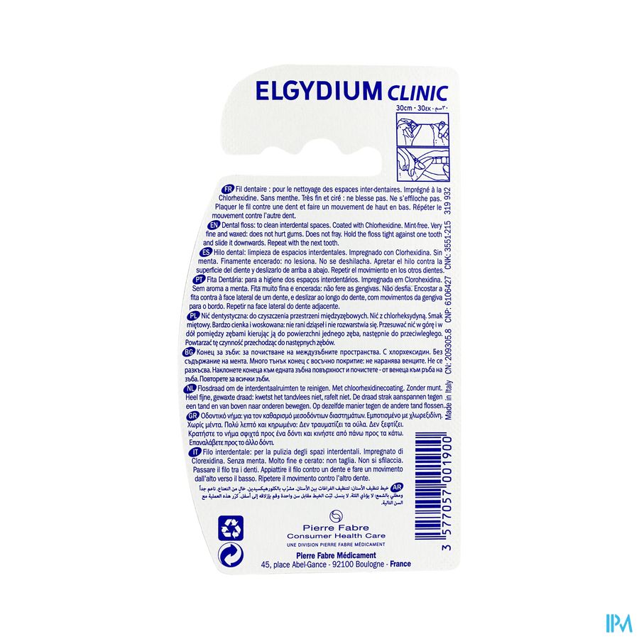 ELGYDIUM Clinic dental floss is dun en resistent en is voor het gemak gewaxt. Het flosdraad is geïmpregneerd met chloorhexidine (een actief ingrediënt met reinigende eigenschappen) en helpt met beschermen tegen cariës. De beste manier om dit te doen is 40 centimeter flosdraad af te knippen met het mesje dat is geïntegreerd in de flosdispenser, de uiteinden van het ELGYDIUM Clinic dental floss om uw wijsvingers te wikkelen en het, strak geleid door uw duimen, tussen uw tanden en kiezen te plaatsen. Het flosdraad is niet-gearomatiseerd, zacht voor het tandvlees en wordt bijzonder aanbevolen voor mensen met implantaten of blootliggende tandhalzen.