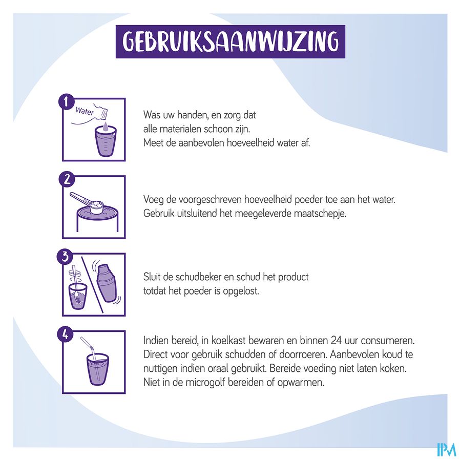 Belangrijk: Indien bereid, in koelkast bewaren en binnen 24 uur consumeren. Direct voor gebruik schudden of doorroeren. Aanbevolen koud te nuttigen indien oraal gebruikt. Bereide voeding niet laten koken. Niet in de microgolf bereiden of opwarmen.