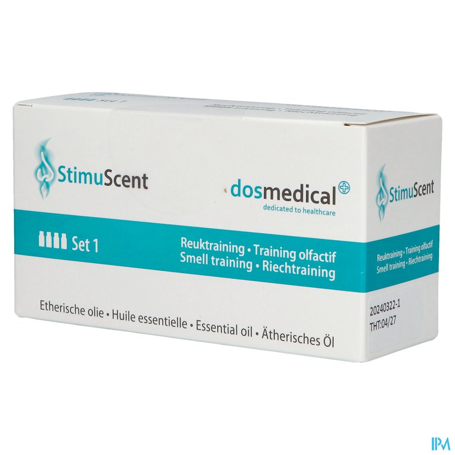 De volledige DOS Medical reuktraining bestaat uit 3 geursets, elk met 4 potjes met etherische oliën met eigen geuren: