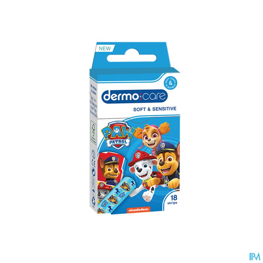 Dermo Care Soft & Sensitive Paw Patrol is een tinnen pleisterdoosje met 18 pleisters met Paw Patrol figuurtjes op afgebeeld.