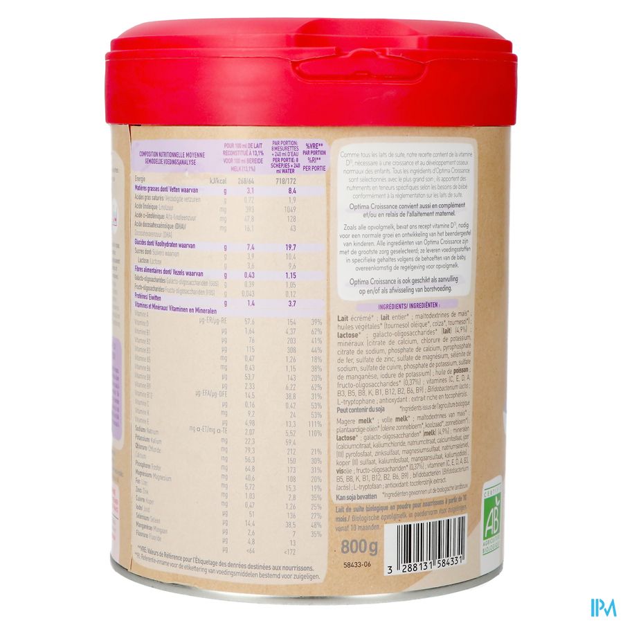Onze Optima Croissance-zuigelingenmelk wordt in Frankrijk gemaakt van goede biologische Franse koemelk en bevat geen onnodige toevoegingen. Onze zuigelingenmelk bevat dus geen palmolie. Tot slot zien we erop toe dat het welzijn van de dieren wordt gewaarborgd (toegang tot de buitenlucht zodra het weer het toelaat, voornamelijk gevoed met voer van de boerderij, enz.).