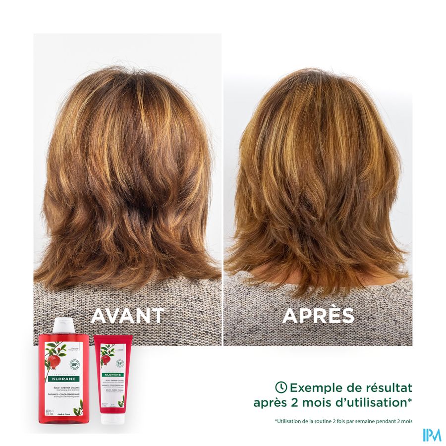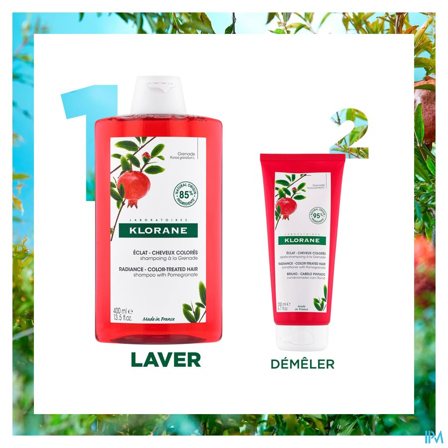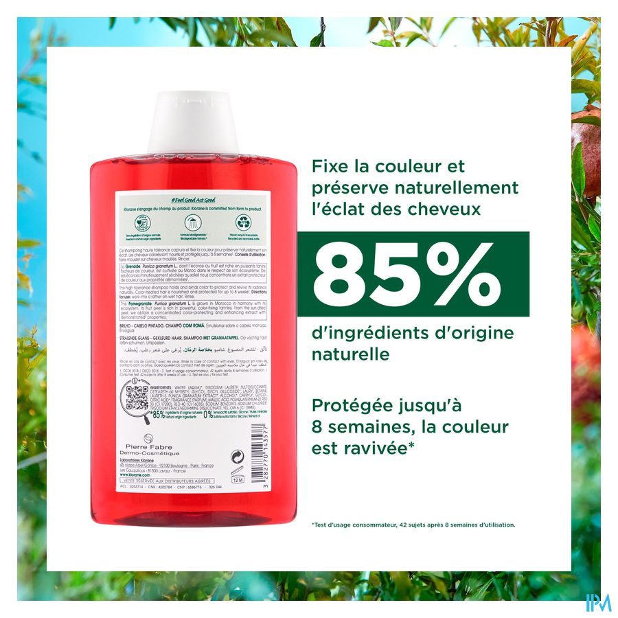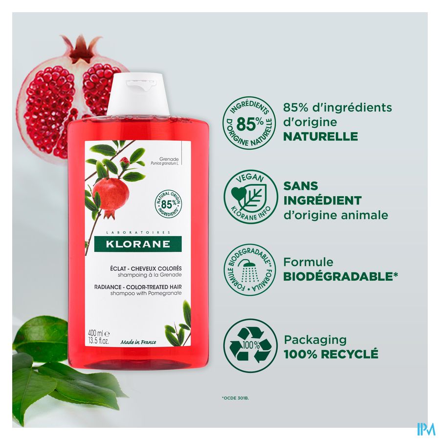 De Glanzend Gekleurd Haar Kleurherstellende en verlengende Shampoo met medicinale Granaatappel, reinigt zachtjes gekleurd haar, fixeert de kleur en verlengt de glans op natuurlijke wijze tot 8 weken*. Vegan**** en zintuiglijk, deze shampoo met hoge tolerantie is verrijkt met extract van granaatappelschillen, een echte kleurbeschermer***. Dit actieve bestanddeel, rijk aan tannines (natuurlijke antioxidanten), vangt en fixeert de pigmenten op de keratine om het uitlopen van de kleur te beperken, terwijl het beschermt tegen externe agressies en geleidelijke vervaging. Het haar is gevoed, zacht en glanzend, de kleur is hersteld en stralend in een heerlijke geur. De formule van de Granaatappel shampoo is biologisch afbreekbaar** en bevat 88% ingrediënten van natuurlijke oorsprong. Zonder gesulfateerde surfactanten of siliconen, is het ook verpakt in een verpakking met minst ens 83% gerecycleerd materiaal en grotendeels recyclebaar.