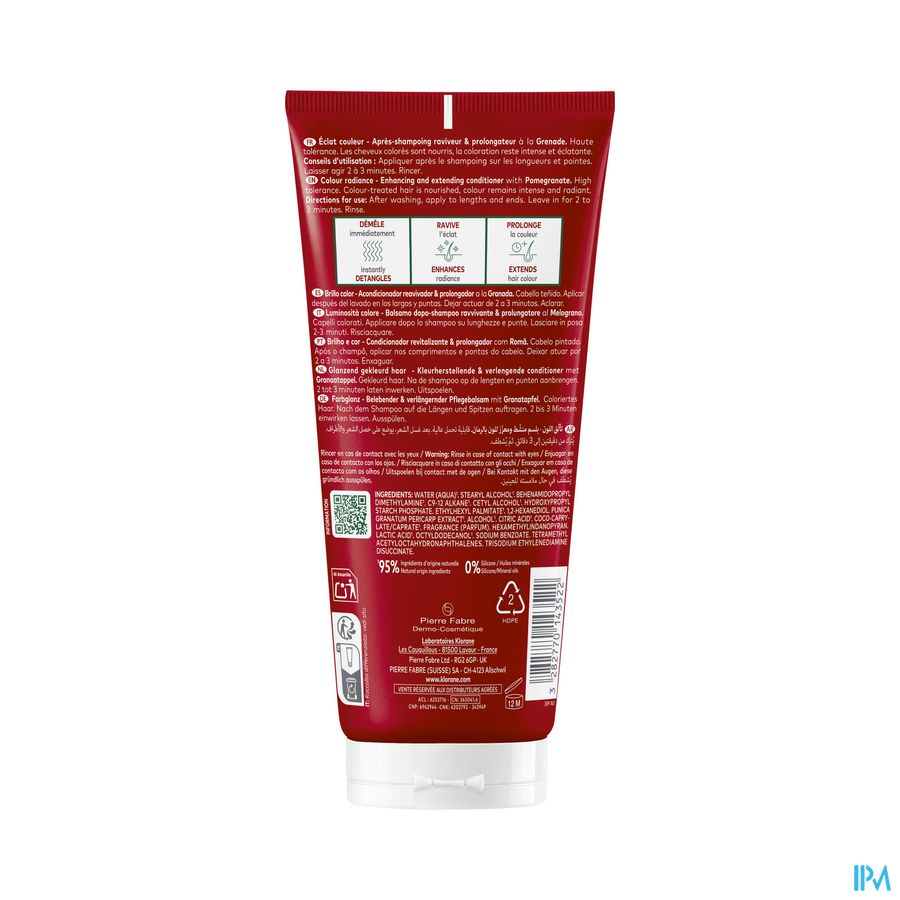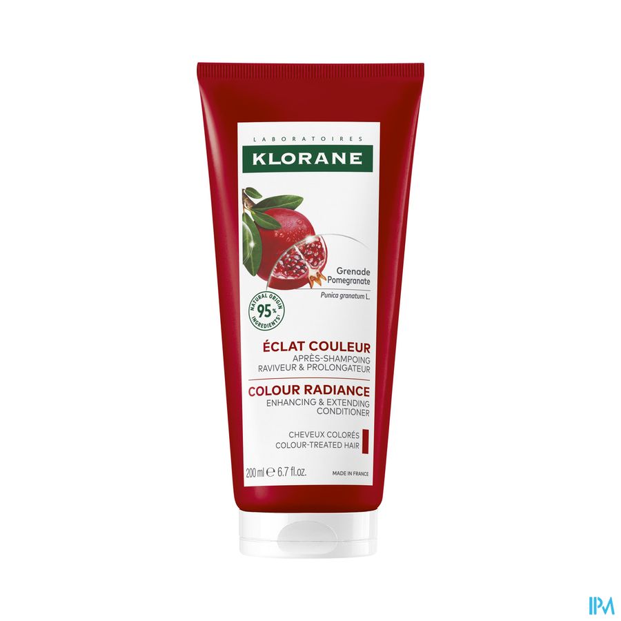 De laboratoria van Klorane hebben de kleurherstellende en verlengende conditioner met medicinale Granaatappel, geformuleerd om voor gekleurd haar te zorgen door zintuiglijkheid en doeltreffendheid te combineren. Samengesteld uit 95% ingrediënten van natuurlijke oorsprong, ontwart en voedt het gekleurd haar terwijl het op natuurlijke wijze hun glans verlengt dankzij het extract van granaatappelschillen. Dit actief bestanddeel, zeer rijk aan tannines, voorkomt het vervagen van de kleur en verlengt de intensiteit en levensduur ervan. De smeltende, goed verdraagbare formule, biologisch afbreekbaar* en zonder siliconen, werkt op de punten en lengtes dankzij een zure pH die helpt om de haarschubben te sluiten. Vanaf het eerste gebruik is gekleurd haar gevoed, gemakkelijk te ontwarren en onthult het al zijn licht, alles dankzij een vegan formule*** verpakt in een tube van 50% gerecycleerd plastic.