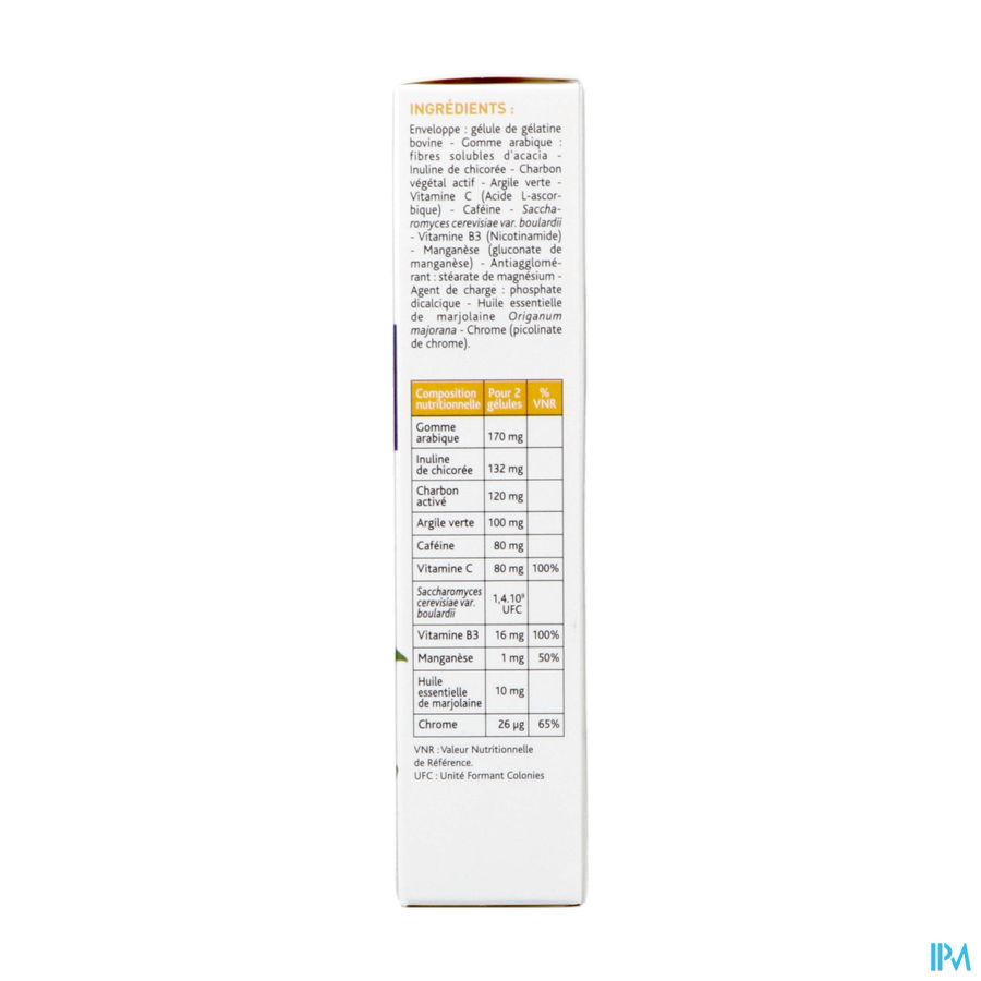 Envelop: Rundergelatinecapsule – Arabische gom: oplosbare acaciavezel – Cichorei-inuline – Geactiveerde plantaardige kool – Groene klei – Vitamine C (L-ascorbinezuur) – Cafeïne – Saccharomyces cerevisiae var. boulardii – Vitamine B3 (Nicotinamide) – Mangaan (mangaangluconaat) – Antiklontermiddel: magnesiumstearaat – Vulstof: dicalciumfosfaat – Etherische olie van marjolein Origanum majorana – Chroom (chroompicolinaat).