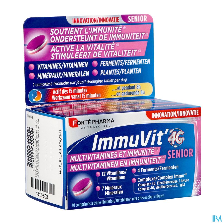 Immuvit'4G Senior brengt 12 vitamines en 7 mineralen samen, in een vereniging gericht op immuniteit, dankzij een hoge dosering vitamine D en zink.
