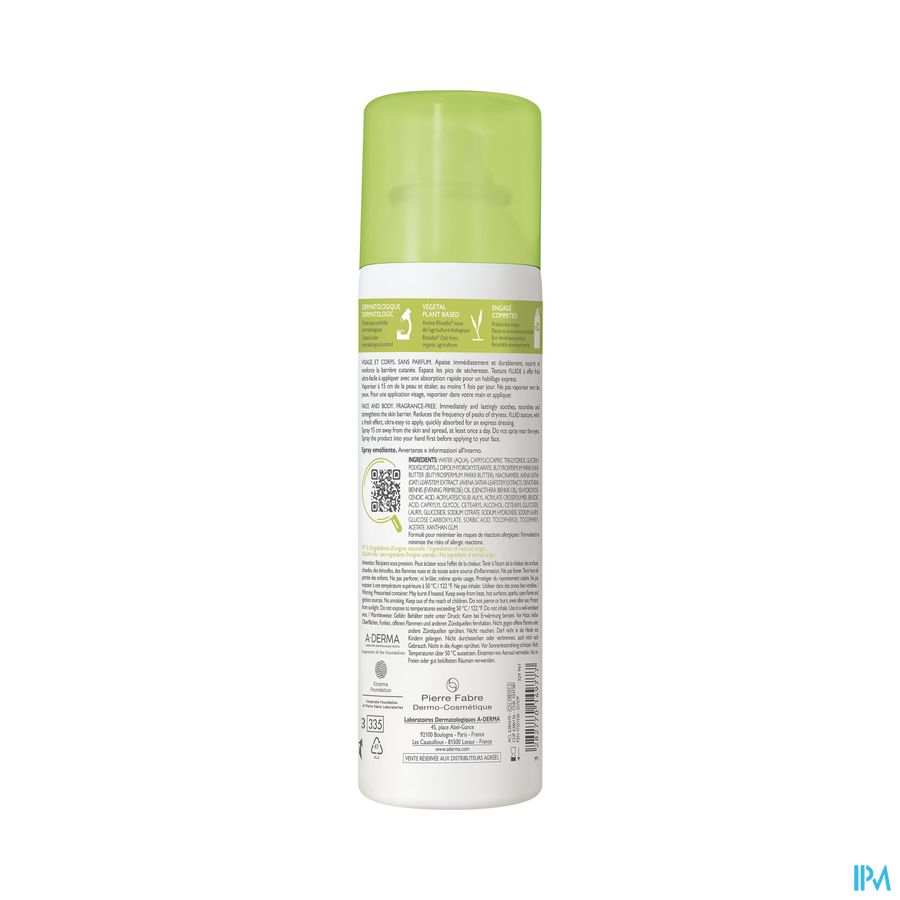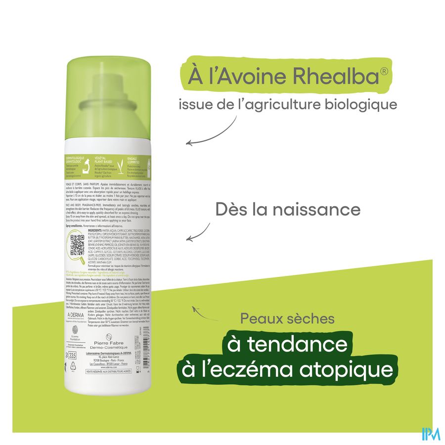 De jeukwerende EMOLLIËRENDE SPRAY is een handig en supersnel verzorgingsproduct dat helpt jeuk* te verzachten en irritatiepieken bij een droge huid met neiging tot atopisch eczeem te spreiden, terwijl de roodheid vermindert. De 360° effectiviteit vermindert de droogheid, versterkt de huidbarrière en helpt het microbioom weer in evenwicht te brengen. Het 360° verstuivingssysteem, zonder gas (dankzij de "pocket valve" technologie) en de snelle absorptie maken het mogelijk om, met een dagelijks doelgericht, doeltreffend en geruststellend gebaar, de droge huid die vatbaar is voor atopisch eczeem te kalmeren en het dagelijkse leven ervan te verbeteren. Een voedende spray op basis van Rhealba® Haverplantextract (jonge haverscheuten), met een vloeibare textuur. Een lichte formule met 97% natuurlijke ingrediënten, niet geparfumeerd, voor gebruik vanaf de geboorte. Rhealba® Haver van biologische teelt. Vegan info: zonder ingrediënten van dierlijke oorsprong.