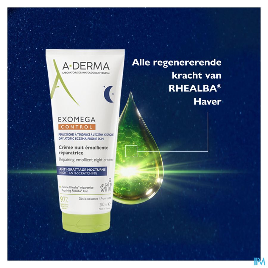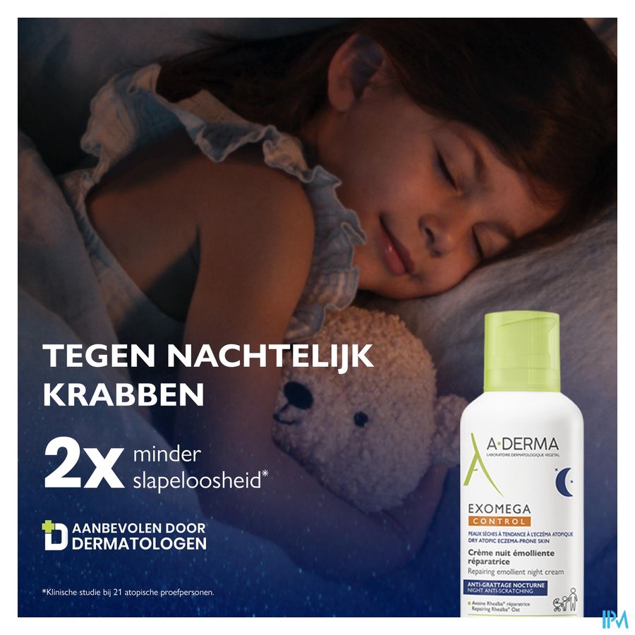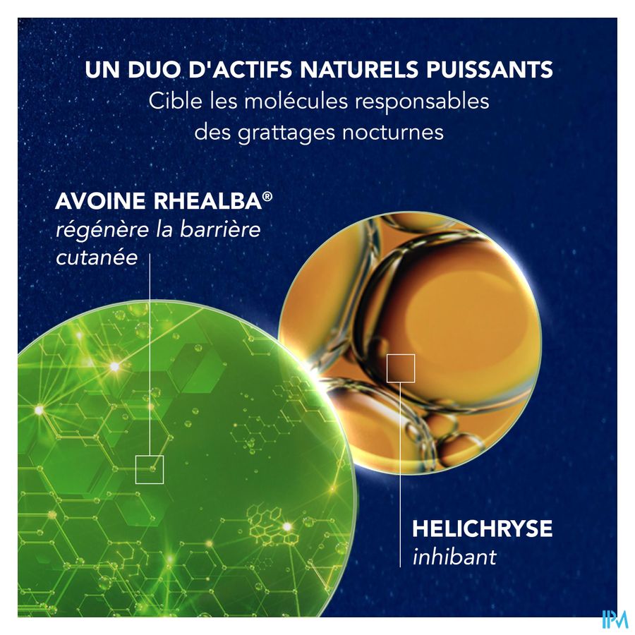 Tegen nachtelijk krabben voor een goede nachtrust. Kalmeert, hydrateert, voedt en herstelt de huidbarrière. Een krachtig nieuw duo van natuurlijke actieve ingrediënten - RHEALBA® & HELICHRYSUM - pakt de moleculen aan die verantwoordelijk zijn voor nachtelijk krabben, om het krabben tegen te gaan en te zorgen voor een rustgevende nachtrust. Speciaal ontwikkeld voor de atopische huid, met gepatenteerde actieve ingrediënten ontwikkeld door het Laboratoire A-DERMA om de symptomen van een droge tot atopische huid te verbeteren.