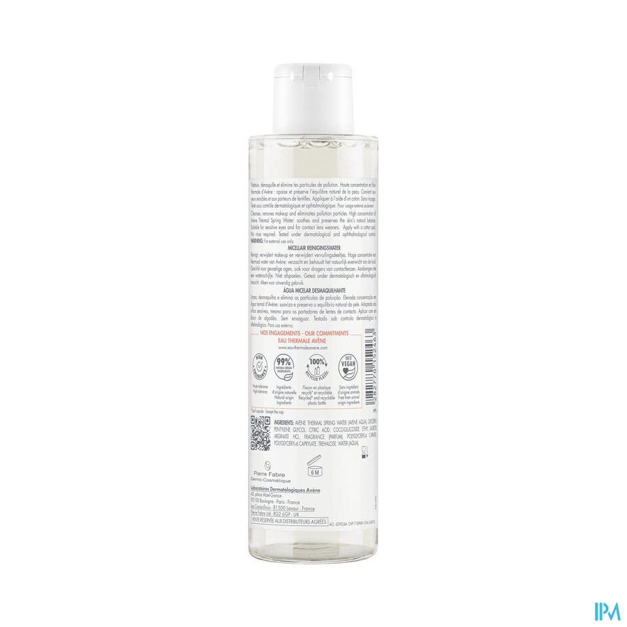 Deze micellaire make-upremover reinigt (en ontdoet de huid van vervuilingsdeeltjes *), hydrateert** en kalmeert het gezicht en de gevoelige ogen in één enkele beweging. Hij bevat 99% ingrediënten van natuurlijke oorsprong en bevat geen ingrediënten van dierlijke oorsprong. De huid is schoon, zacht, gekalmeerd en comfortabel. Dit frisse, subtiel geparfumeerde water verwijdert make-up en maakt de huid zacht in één eenvoudige en snelle beweging. Het verbetert de hydratatie en behoudt het natuurlijke evenwicht van de huid dankzij de combinatie van glycerine, trehalose en een hoge concentratie thermaal water van Avène met kalmerende eigenschappen. De formule bevat enkel de strikt noodzakelijke ingrediënten in de juiste hoeveelheid, om dermatologische doeltreffendheid en tolerantie te garanderen***. Het Micellair reinigingswater is geschikt voor dragers van contactlenzen. De verpakking van het Micellair reinigingswater 400 ml bevat 87% gerecycled materiaal. Het flesje is gemaakt van 100% gerecycled plastic****.