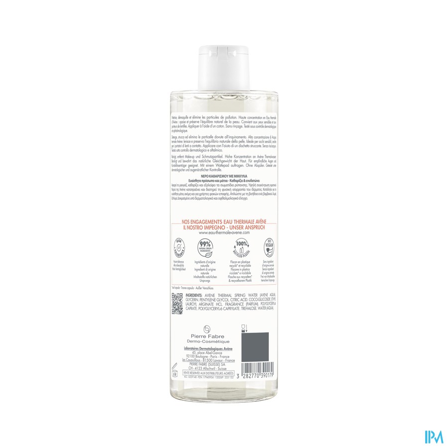 Deze micellaire make-upremover reinigt (en ontdoet de huid van vervuilingsdeeltjes *), hydrateert** en kalmeert het gezicht en de gevoelige ogen in één enkele beweging. Hij bevat 99% ingrediënten van natuurlijke oorsprong en bevat geen ingrediënten van dierlijke oorsprong. De huid is schoon, zacht, gekalmeerd en comfortabel. Dit frisse, subtiel geparfumeerde water verwijdert make-up en maakt de huid zacht in één eenvoudige en snelle beweging. Het verbetert de hydratatie en behoudt het natuurlijke evenwicht van de huid dankzij de combinatie van glycerine, trehalose en een hoge concentratie thermaal water van Avène met kalmerende eigenschappen. De formule bevat enkel de strikt noodzakelijke ingrediënten in de juiste hoeveelheid, om dermatologische doeltreffendheid en tolerantie te garanderen***. Het Micellair reinigingswater is geschikt voor dragers van contactlenzen. De verpakking van het Micellair reinigingswater 400 ml bevat 87% gerecycled materiaal. Het flesje is gemaakt van 100% gerecycled plastic****.