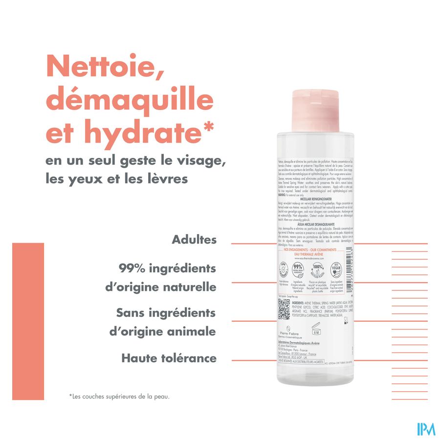 Deze micellaire make-upremover reinigt (en ontdoet de huid van vervuilingsdeeltjes *), hydrateert** en kalmeert het gezicht en de gevoelige ogen in één enkele beweging. Hij bevat 99% ingrediënten van natuurlijke oorsprong en bevat geen ingrediënten van dierlijke oorsprong. De huid is schoon, zacht, gekalmeerd en comfortabel. Dit frisse, subtiel geparfumeerde water verwijdert make-up en maakt de huid zacht in één eenvoudige en snelle beweging. Het verbetert de hydratatie en behoudt het natuurlijke evenwicht van de huid dankzij de combinatie van glycerine, trehalose en een hoge concentratie thermaal water van Avène met kalmerende eigenschappen. De formule bevat enkel de strikt noodzakelijke ingrediënten in de juiste hoeveelheid, om dermatologische doeltreffendheid en tolerantie te garanderen***. Het Micellair reinigingswater is geschikt voor dragers van contactlenzen. De verpakking van het Micellair reinigingswater 400 ml bevat 87% gerecycled materiaal. Het flesje is gemaakt van 100% gerecycled plastic****.