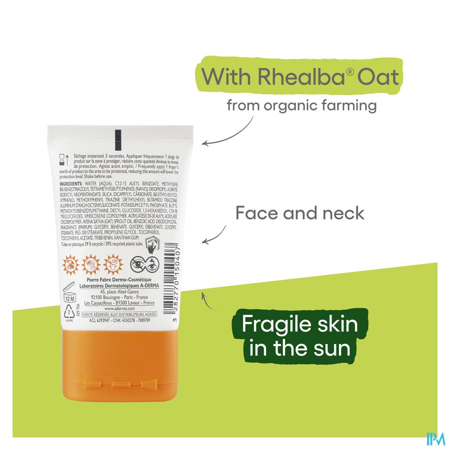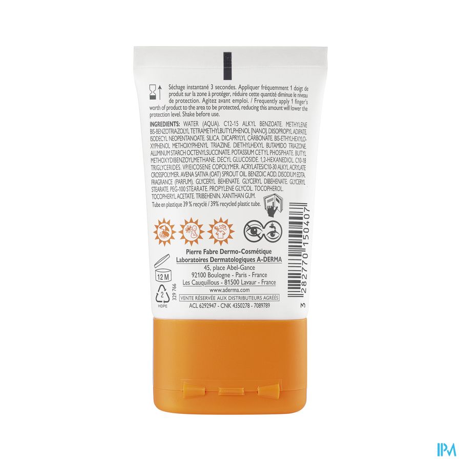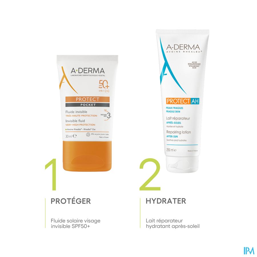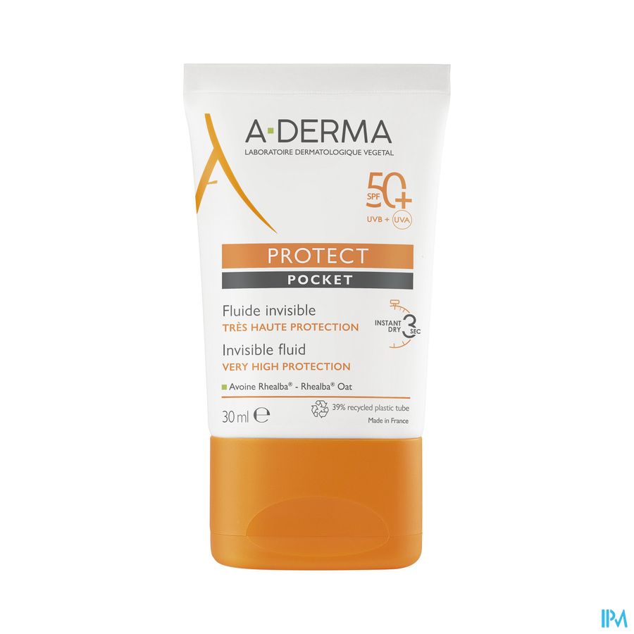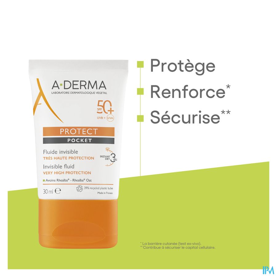 Altijd bij de hand, A-DERMA PROTECT POCKET - SPF 50+ beschermt de fragiele gemengde tot vette huid tegen de zon en vervuiling. Dankzij zijn praktische pocketformaat kunt u hem overal mee naartoe nemen (stad, openlucht...), ongeacht uw activiteit (sport of ontspanning). Het duo van poeders, geïntegreerd in de formule, absorbeert onmiddellijk talg van het huidoppervlak. De "Instant Dry 3 seconds" technologie ("onmiddellijk droog" in drie seconden) laat geen witte vlekken of vettige film achter op de huid. PROTECT POCKET Onzichtbare Zonnefluide Gezicht SPF50+ is waterbestedig, versterkt en beschermt de fragiele huid tegen schade veroorzaakt door de zon, met name dankzij Barriestolide® van Rhealba® haverkiemolie. Een gepatenteerde* zonnebeschermingsinnovatie die het resultaat is van zeven jaar onderzoek. Dankzij de strenge selectie en de geoptimaliseerde concentratie van filters en ingrediënten is dit het beste antwoord op de behoefte aan dagelijkse bescherming tegen de zon. Al onze filters zijn geëvalueerd door onafhankelijke laboratoria, die hebben aangetoond dat onze A-DERMA PROTECT-filters geen invloed hebben op organismen die representatief zijn voor het zeemilieu, met name koralen (zie hieronder - rubriek 'Ecologisch verantwoorde filters'). Rhealba® Haver van biologische teelt. Vegan Info: zonder dierlijke ingrediënten. Tube van gerecycleerd plastiek * Patent aangevraagd