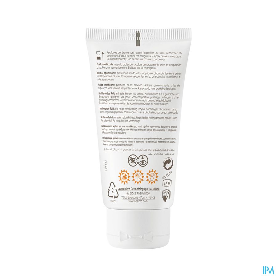 • BESCHERMT de huid met zijn breed-spectrumbescherming (lange en korte UVA en UVB), fotostabiliteit en waterbestendigheid. De matterende zonnefluid en de strenge selectie van filters en ingrediënten bieden een optimale tolerantie voor de fragiele huid met neiging tot acne. • VERSTERKT de natuurlijke barrièrefunctie van de huid. • VEILIGSTELLEN van de huidcellen tegen UVA-stralen dankzij Bariestolide® met antioxidante eigenschappen en die de celontgifting verbetert* • REGELT overtollig talg dankzij Glutaminezuur. • MATTEERT dankzij de matterende poeders in de formule, voor een niet-vette finish. Vegan Info: zonder ingrediënten van dierlijke oorsprong.