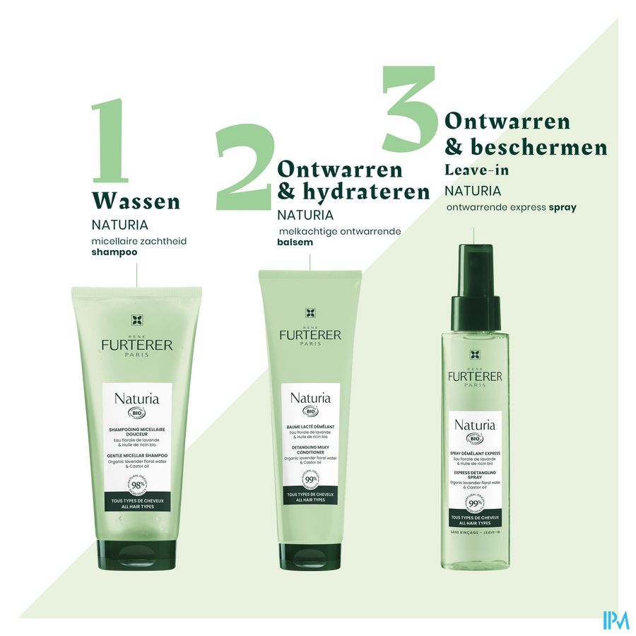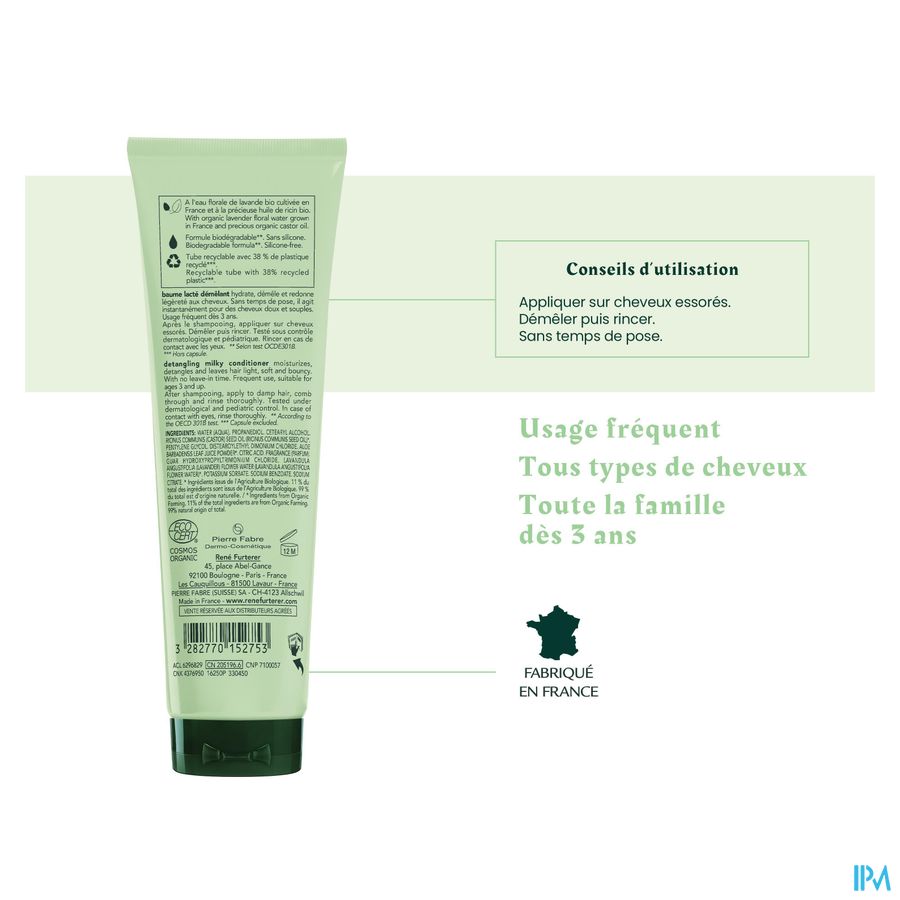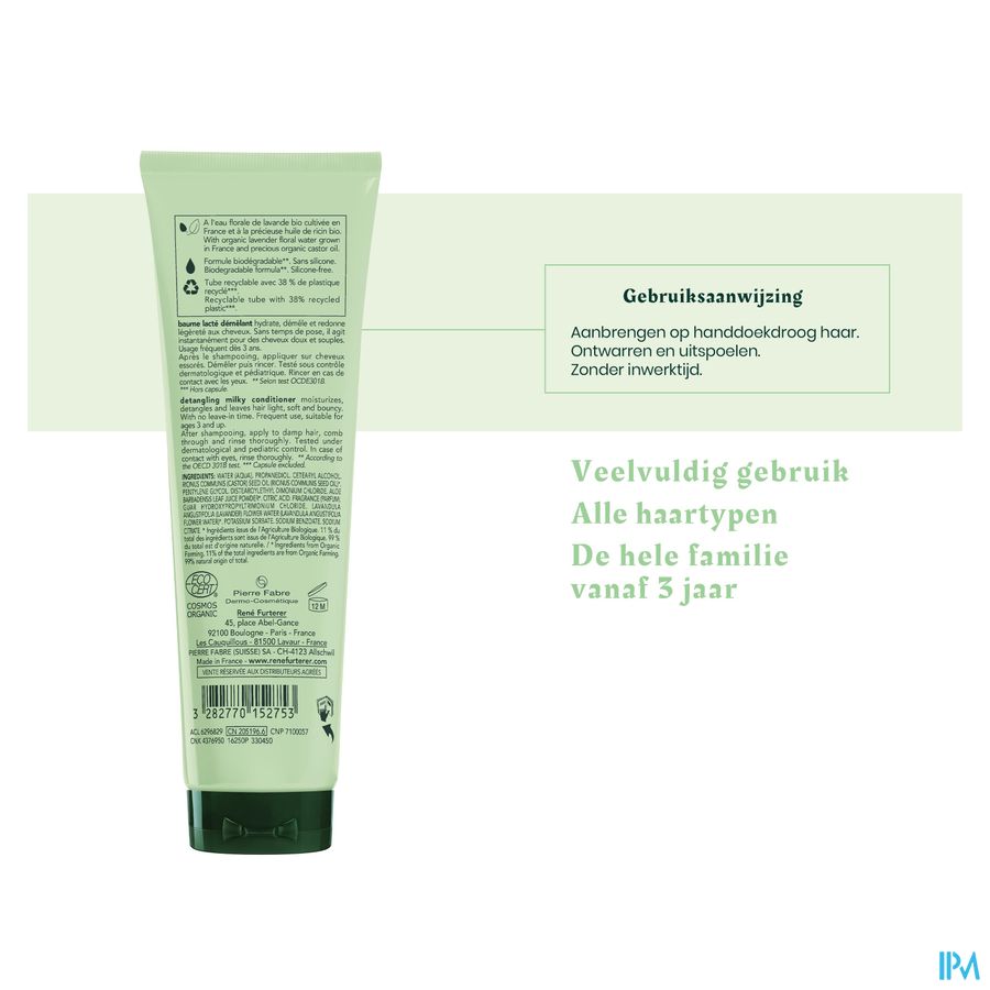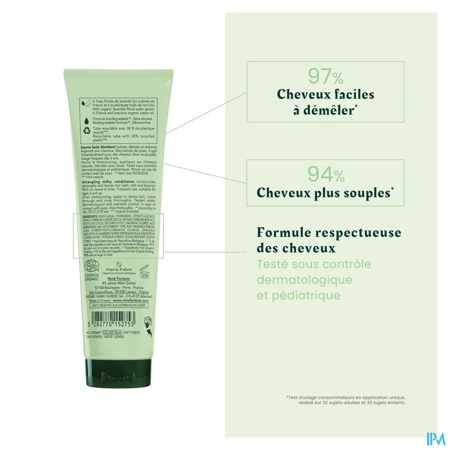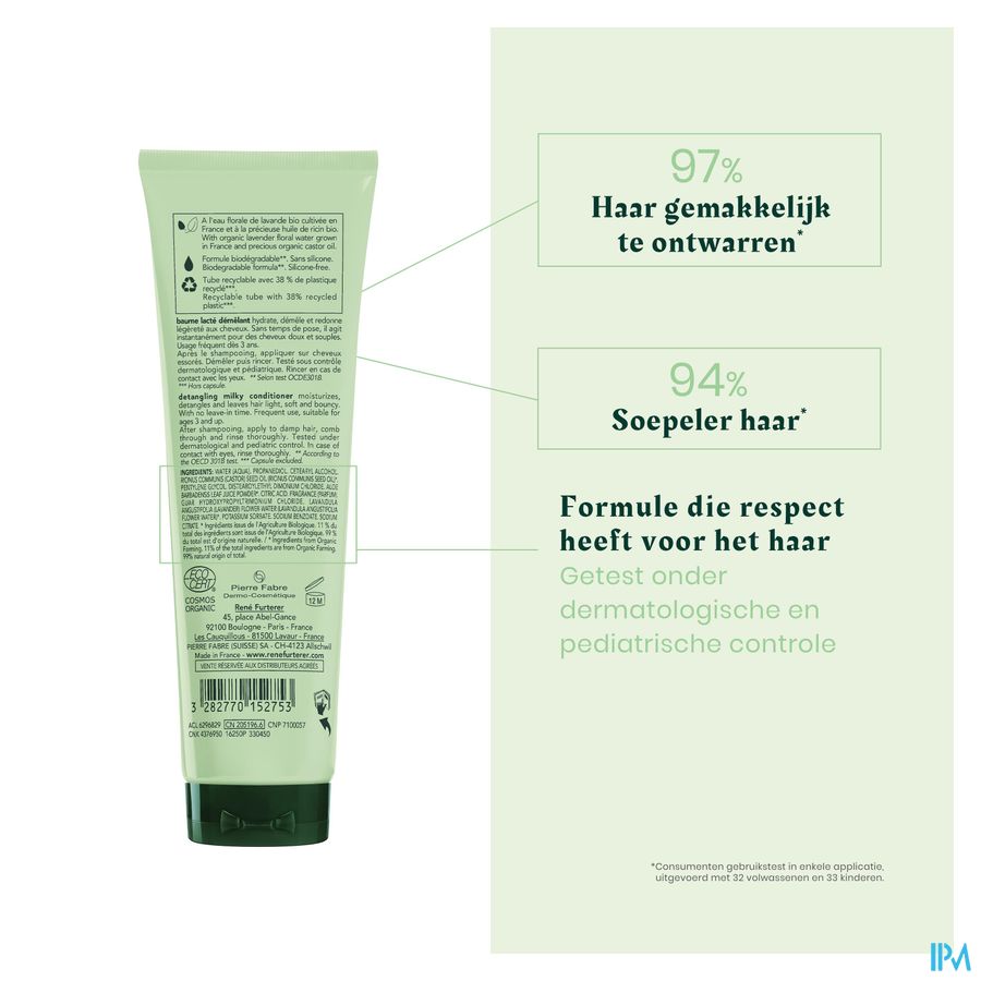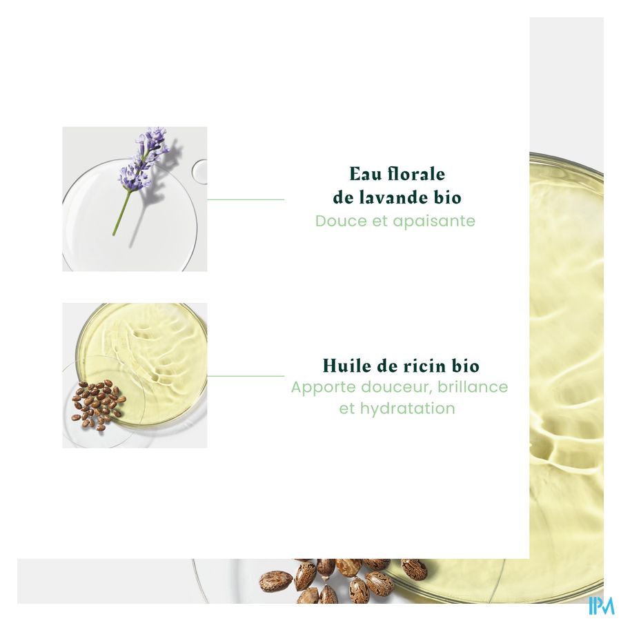 Deze gecertificeerde biologische ontwarrende verzorging voor alle haartypes zonder inwerktijd ontwart zonder de haarvezel te verzwaren. De deskundige formule met biologisch lavendelbloesemwater en biologische ricinusolie maakt het tot een perfecte dagelijkse verzorging voor het hele gezin, vanaf 3 jaar. Deze melkachtige en subtiel geparfumeerde verzorging smelt in het haar om het te hydrateren en onmiddellijk te ontwarren. Mooi, gezond, zacht en glanzend, het haar is licht en perfect ontward. Gecertificeerd biologisch. Formule van 99% natuurlijke oorsprong. Biologisch afbreekbaar*. Vegan**. Een minimum aan siliconen. *Volgens de OECD301B test