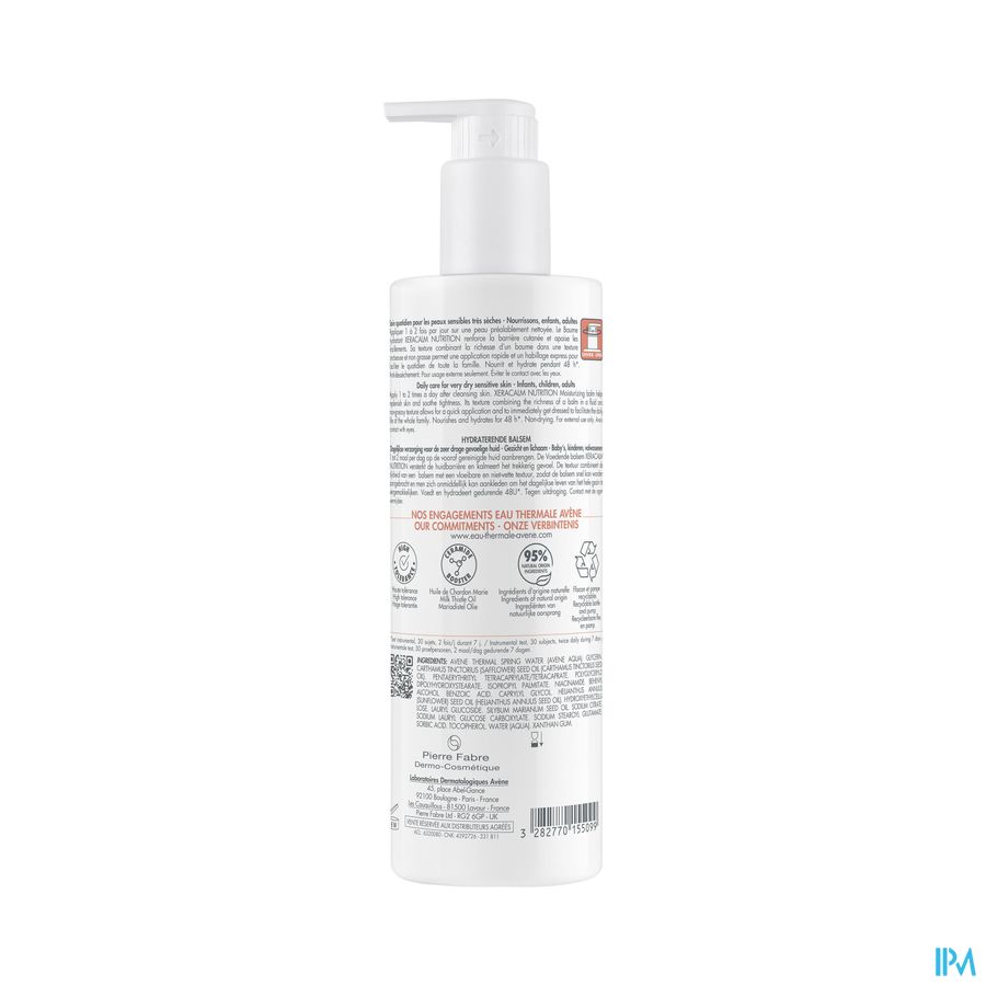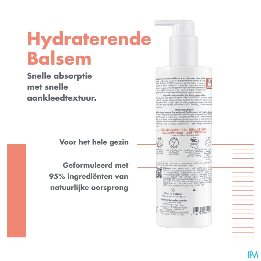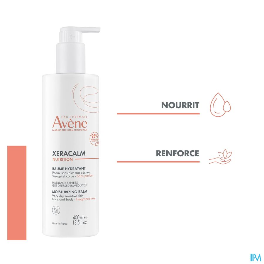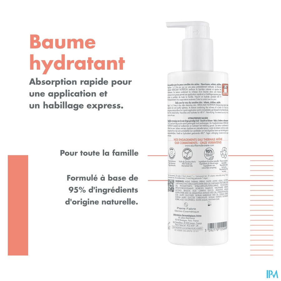 Deze dagverzorging met hoge tolerantie bestaat voor 95% uit bestanddelen van natuurlijke oorsprong. Deze crème versterkt de huidbarrière van gezicht en lichaam. Hydraterende en voedende crème voor de gevoelige en zeer droge huid van het hele gezin. De formule bevat mariadistelolie die de synthese van ceramiden stimuleert en huiduitdroging voorkomt. De ongeparfumeerde formule met romige, niet-vettige textuur laat zich erg vlot aanbrengen. Vermindert het trekkerige gevoel, voedt en hydrateert de huid 48 uur lang*. XERACALM NUTRITION hydraterende crème is op milieuverantwoorde wijze vervaardigd. De verpakking met 400 ml inhoud bestaat voor 70% uit gerecycleerd materiaal. Het flesje is gemaakt van 100% gerecycleerd plastic**