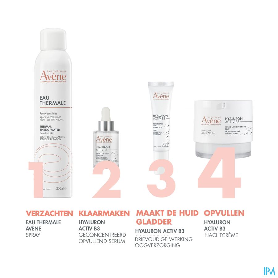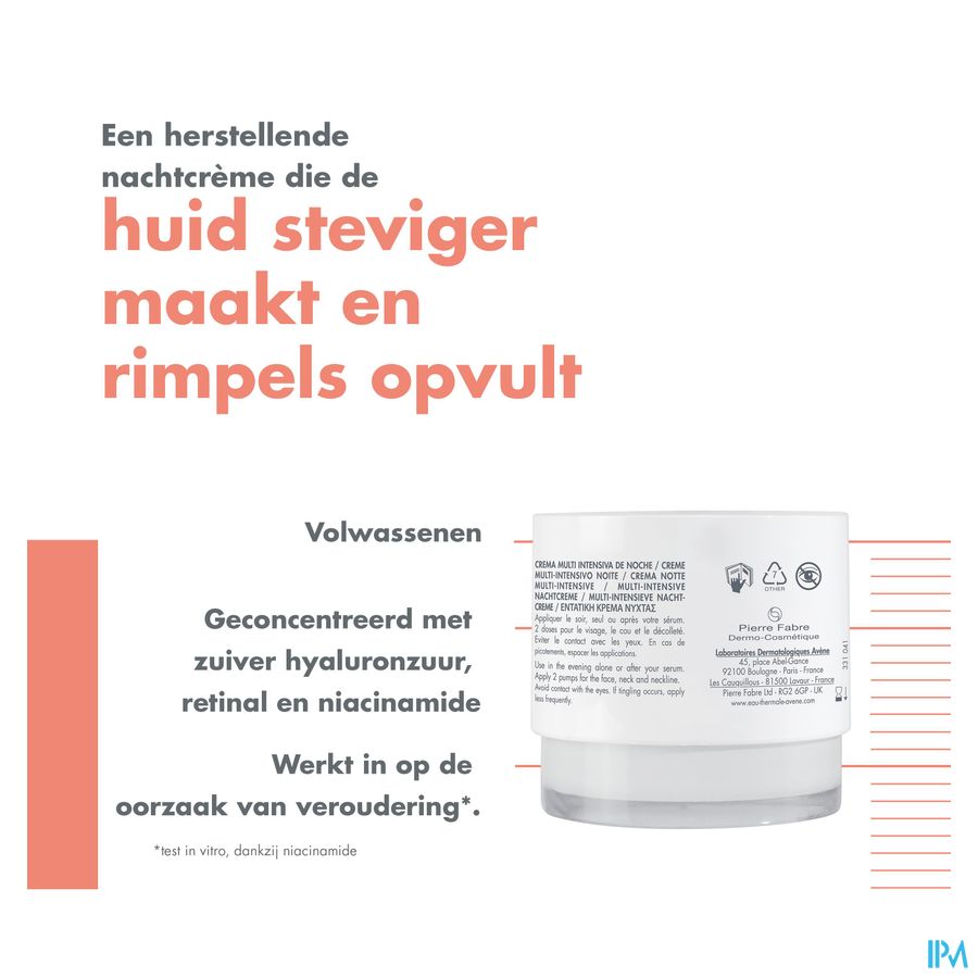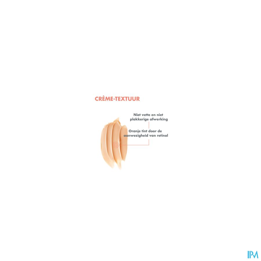 AVENE THERMAL SPRING WATER (AVENE AQUA). CAPRYLIC/CAPRIC TRIGLYCERIDE. GLYCERIN. SQUALANE. BUTYROSPERMUM PARKII (SHEA) BUTTER (BUTYROSPERMUM PARKII BUTTER). CARTHAMUS TINCTORIUS (SAFFLOWER) SEED OIL (CARTHAMUS TINCTORIUS SEED OIL). PENTAERYTHRITYL TETRACAPRYLATE/TETRACAPRATE. CETEARYL ALCOHOL. BEHENYL ALCOHOL. NIACINAMIDE. C20-22 ALKYL PHOSPHATE. C20-22 ALCOHOLS. RETINAL. SODIUM HYALURONATE. TERMINALIA CHEBULA FRUIT EXTRACT. ADENOSINE. ACACIA SENEGAL GUM. CETEARYL GLUCOSIDE. DIMETHYL PHENETHYL ACETATE. FRAGRANCE (PARFUM). GERANYL ACETATE. HELIANTHUS ANNUUS (SUNFLOWER) SEED OIL (HELIANTHUS ANNUUS SEED OIL). RED 33 (CI 17200). SODIUM BENZOATE. SODIUM HYDROXIDE. TOCOPHEROL. TOCOPHERYL GLUCOSIDE. TRIMETHYLCYCLOPENTENYL METHYLISOPENTENOL. XANTHAN GUM