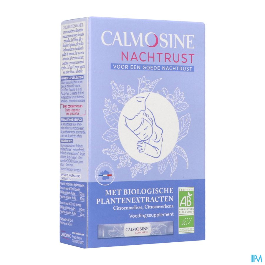 Calmosine Nachtrust is een natuurlijk en zacht voedingssupplement, BIO gecertificeerd, te gebruiken om rustige nachten te hebben. Calmosine Nachtrust heeft een bijzonder gunstige invloed op kinderen vanaf één jaar in geval van slaapstoornissen (moeilijk inslapen, 's nachts wakker worden, 's morgens vroeg wakker worden): eenmaal gekalmeerd vallen ze gemakkelijker in slaap en vinden ze een regelmatige slaap.