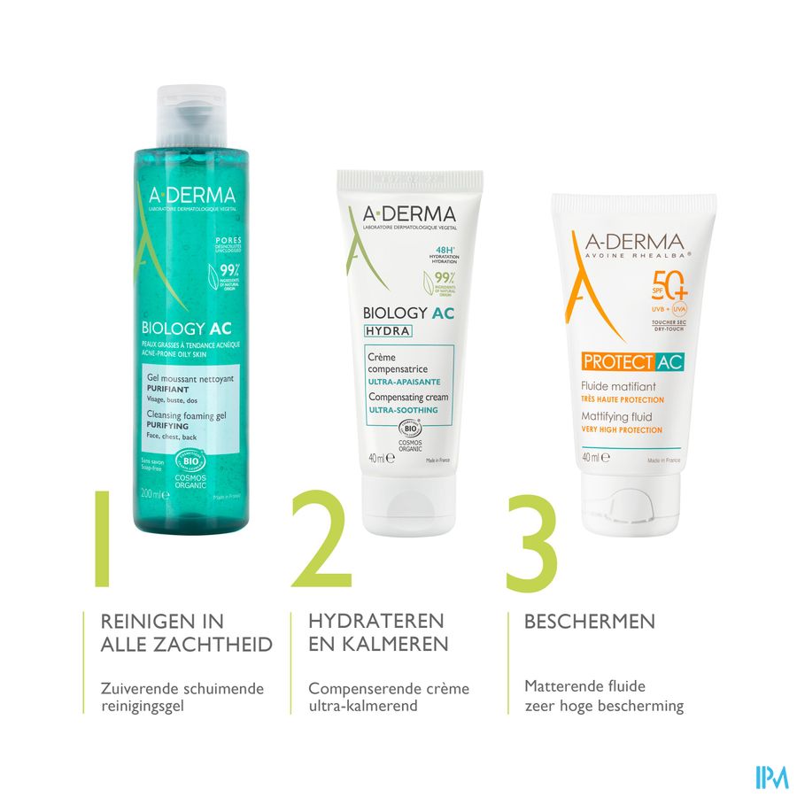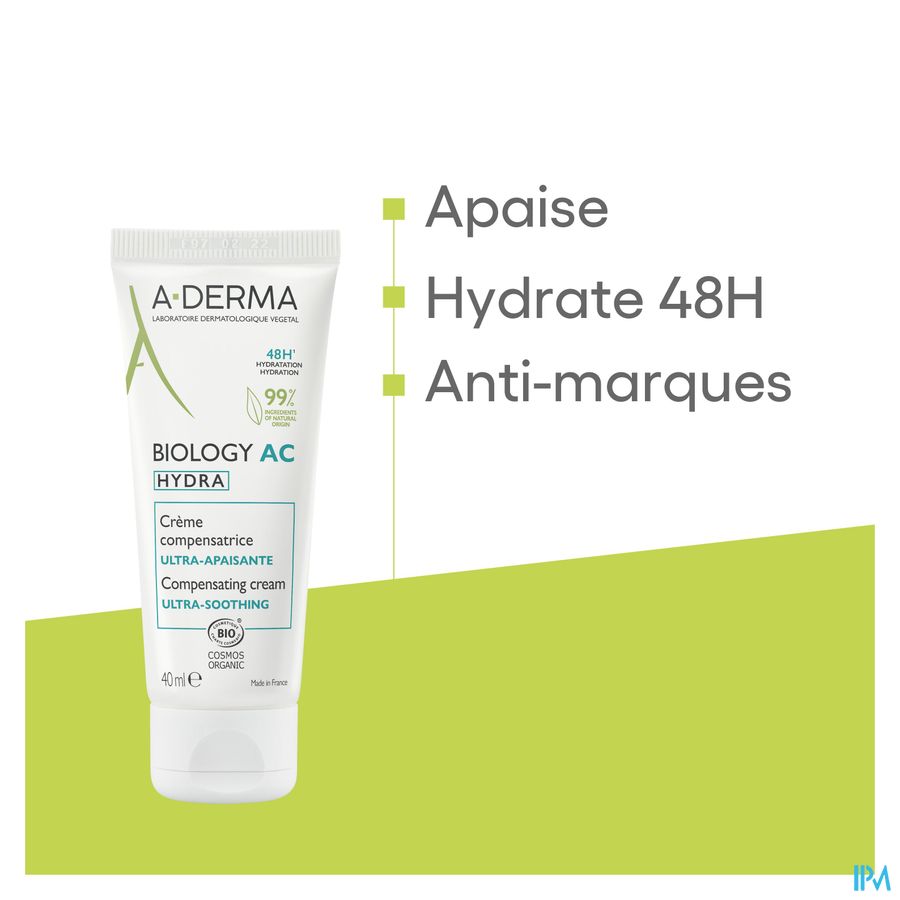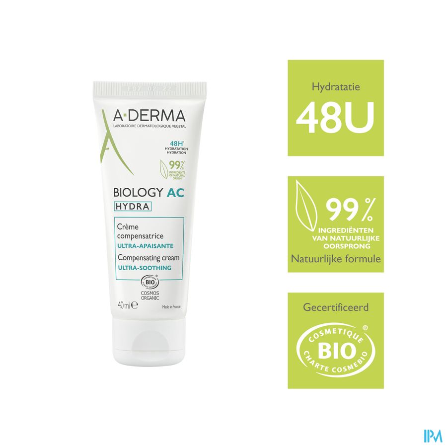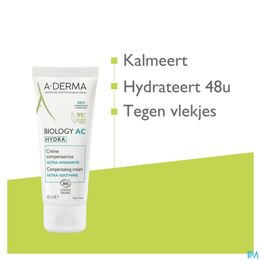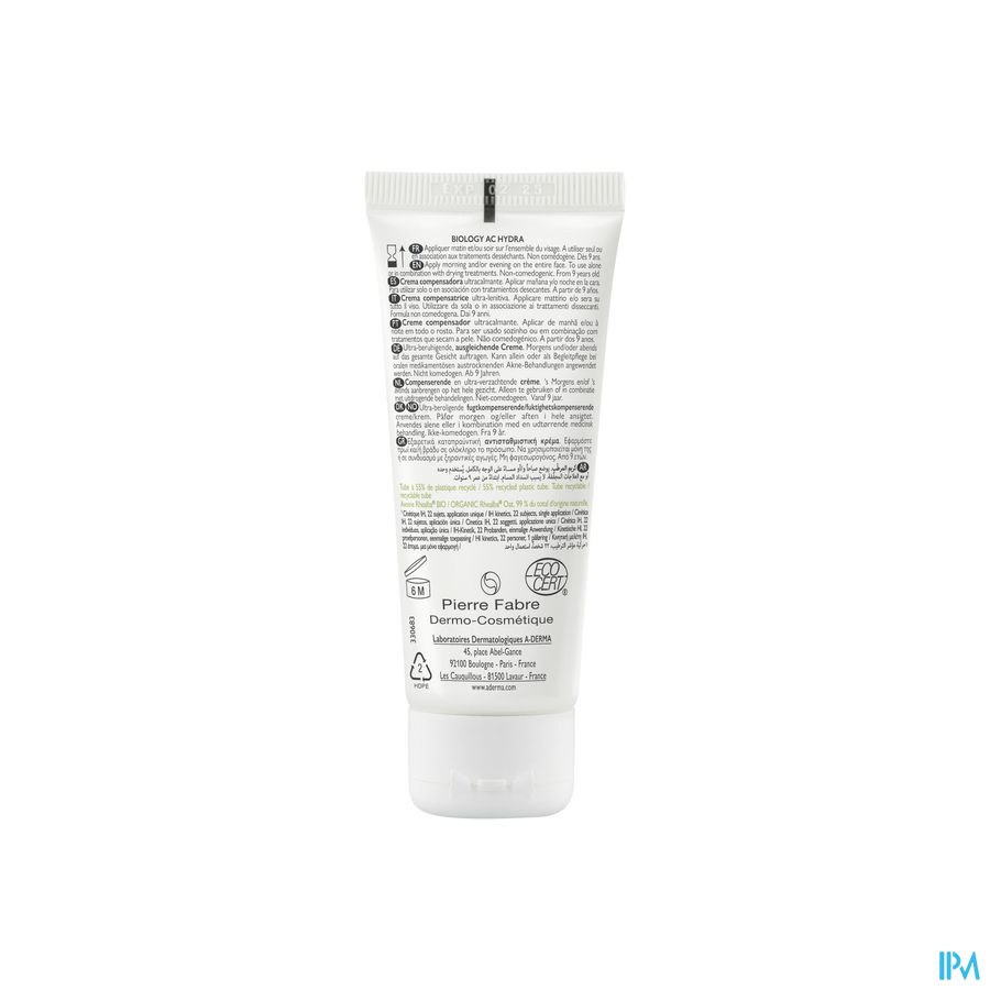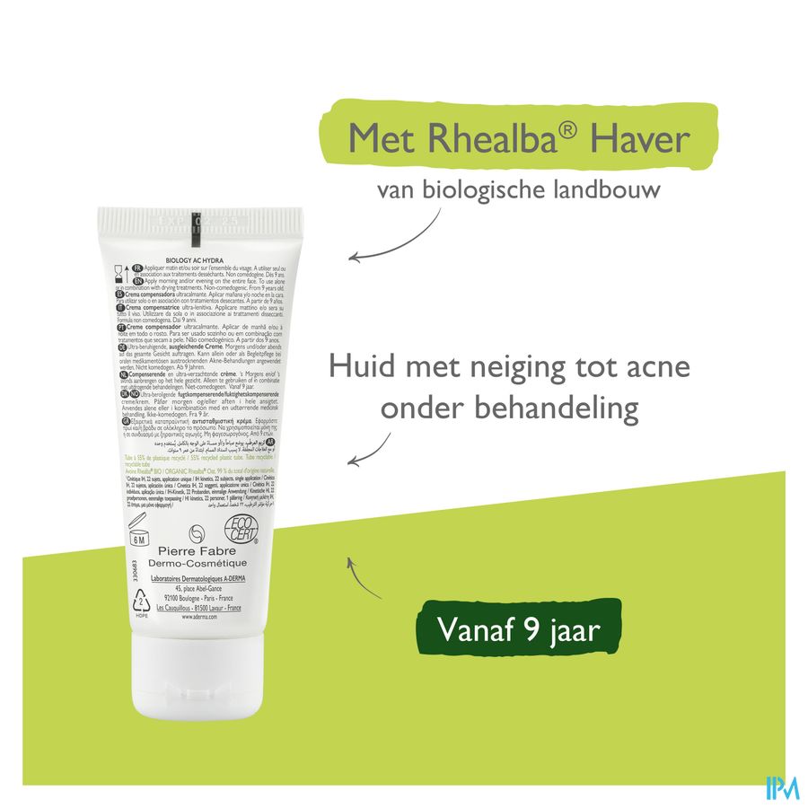 Dit bijzonder verzachtende dermatologisch & gecertificeerd BIO huidverzorgingsproduct compenseert het uitdrogende en irriterende effect van behandelingen. Het verzacht puistjes en roodheid, vermindert rode en bruine vlekjes en hydrateert de kwetsbare huid gedurende 48 uur*. De formule beschermt de huidbarrière tegen vervuilende deeltjes, en zorgt ervoor dat de kwetsbare huid zichzelf weer in evenwicht brengt.ng. De huid voelt opnieuw zacht, soepel en comfortabel aan. Biology AC Hydra is getest in combinatie met toonaangevende topische en orale behandelingen voor de acnegevoelige huid en is geschikt voor gebruik vanaf 9 jaar, bedoeld voor de huid van tieners en volwassenen. De formule bestaat voor 99% uit bestanddelen van natuurlijke oorsprong, waaronder Rhealba® Haver uit van biologische teelt. Romige crème, lichtjes geparfumeerd met de geur van aromatische planten. Vegan info: bevat geen ingrediënten van dierlijke oorsprong. *HI kinetics, 22 personen, eenmalig gebruik.