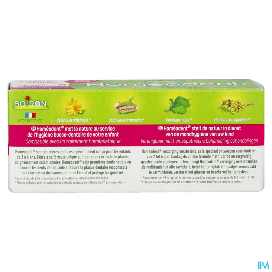 Homéodent® first tanden care is een gefluorideerde tandpasta met plantenextracten , die de melktanden op milde wijze reinigt, tandplak helpt verminderen die verantwoordelijk is voor de vorming van gaatjes, het glazuur versterkt en het tandvlees beschermt.