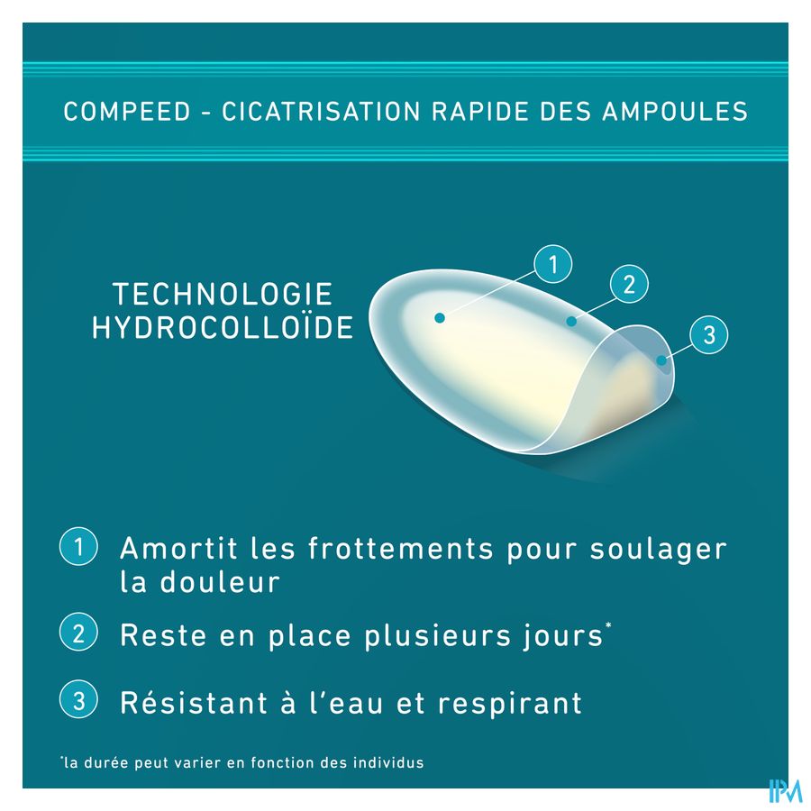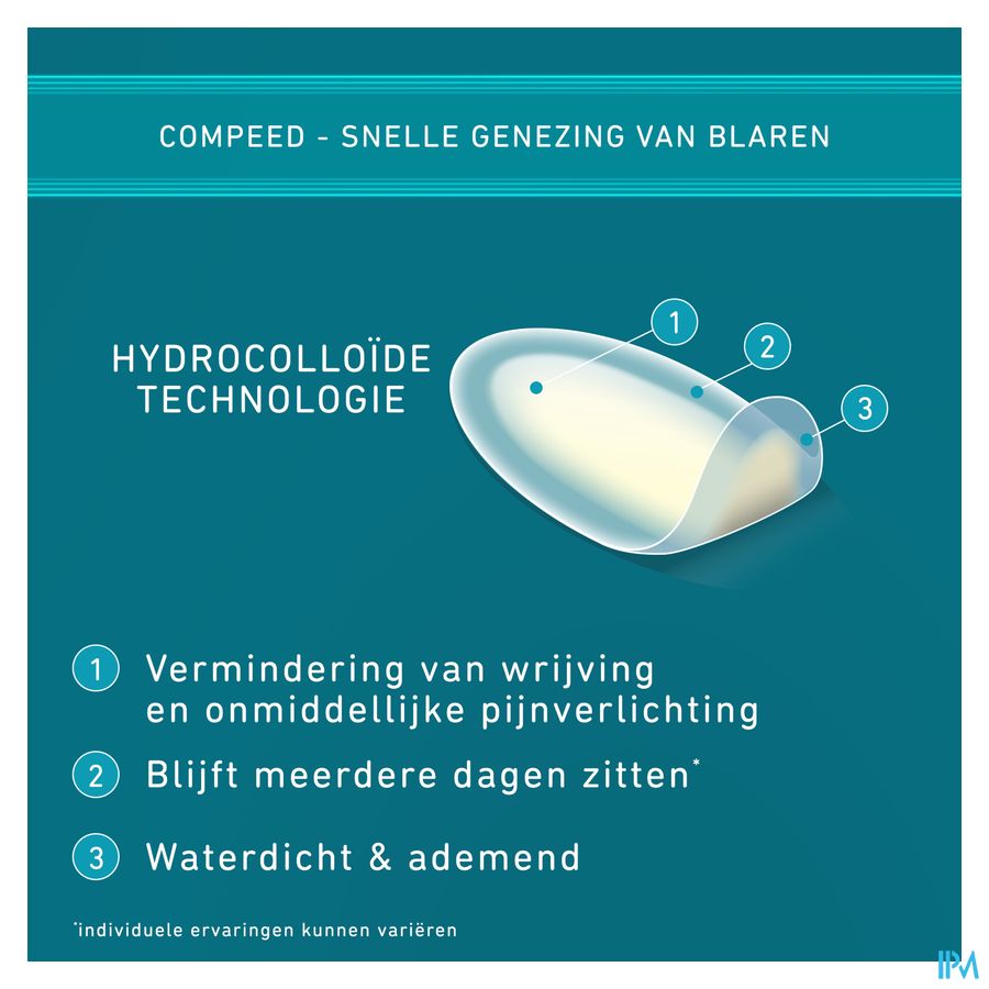 De blarenpleisters van Compeed® zorgen voor onmiddellijke pijnverlichting en een snelle genezing. Het gelkussentje verspreidt de druk op de blaar en neemt tegelijk de wrijving weg. De hydrocolloïdgel in de pleister neemt overtollig vocht op en zorgt voor de beste omstandigheden voor het herstel van de huid.