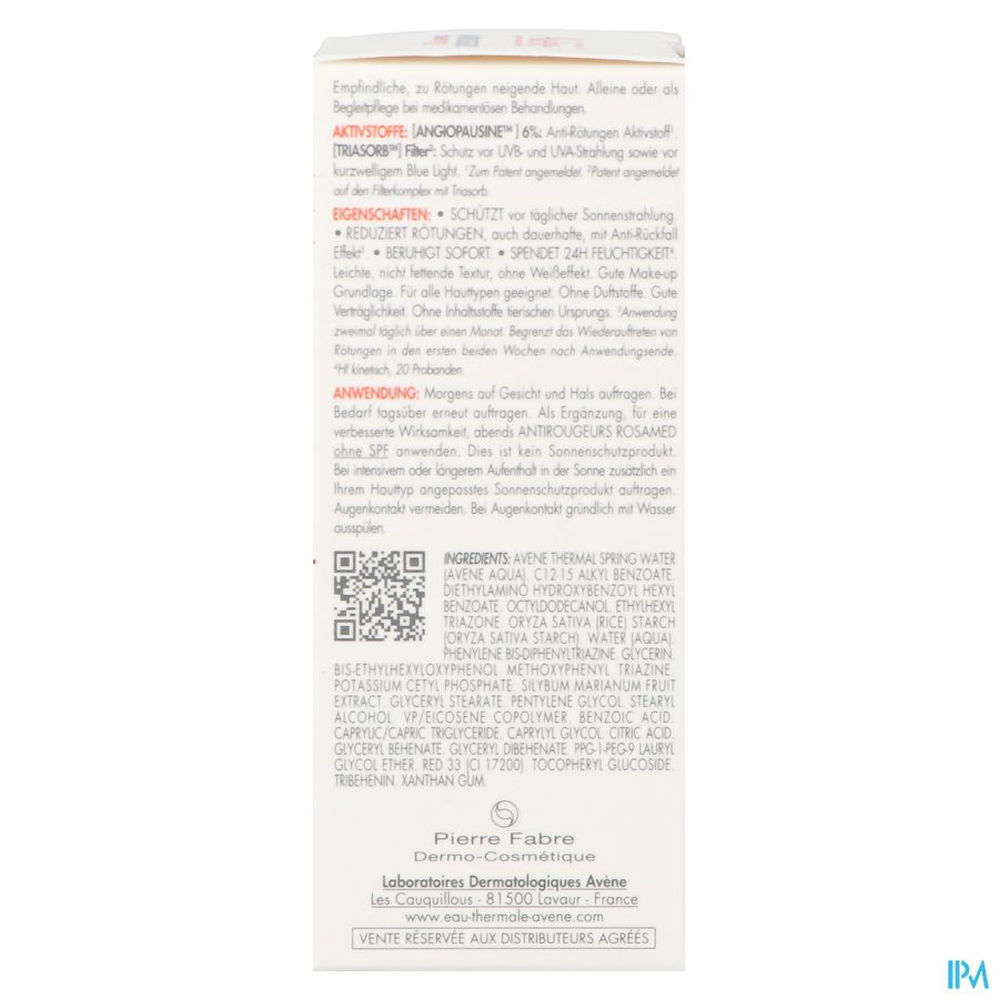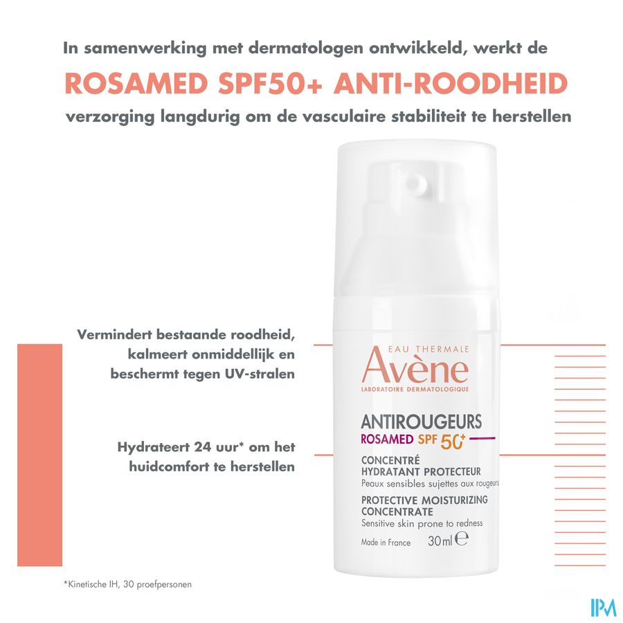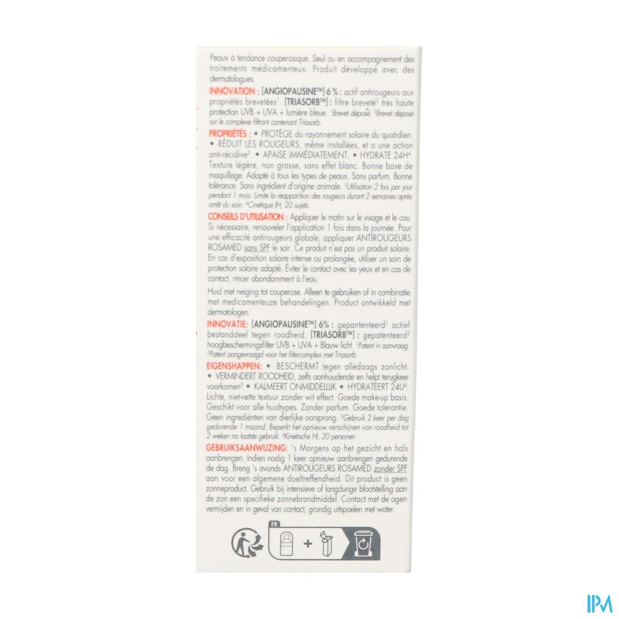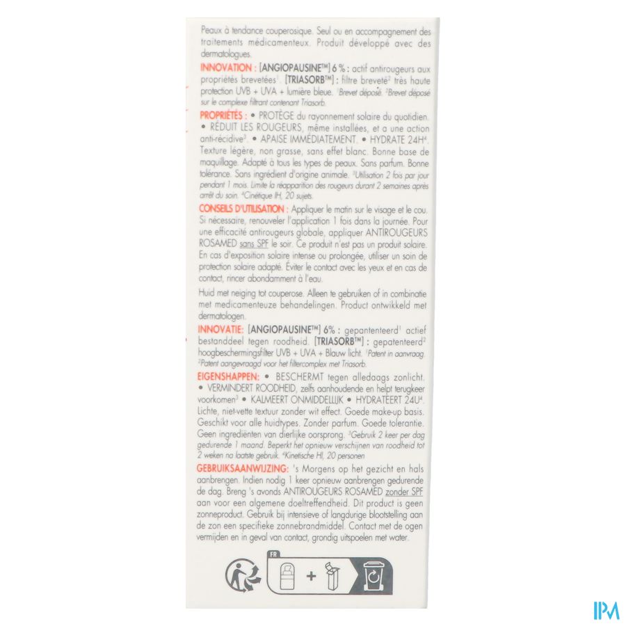 ANTIROUGEURS ROSAMED SPF 50+ is een dagelijks huidverzorgingsproduct dat zowel een langdurige werking tegen de bron van roodheid als een zeer hoge bescherming tegen UV-stralen biedt, de grootste vijand van de huid die naar roodheid neigt. In slechts 2 weken tijd halveert het de frequentie van roodheid* en verzacht het dat branderige gevoel met 90%**. Hydrateert de huid 24 uur lang***. Ons actieve bestanddeel Angiopausine™ vormt het resultaat van meer dan 3 jaar onderzoek en is afkomstig van de mariadistel. De dosering van 6% izorgt ervoor dat oppervlakkige hypervascularisatie wordt verminderd. Lichte, niet-vettige crème. Ongeparfumeerd voor de gevoelige en reactieve huid.