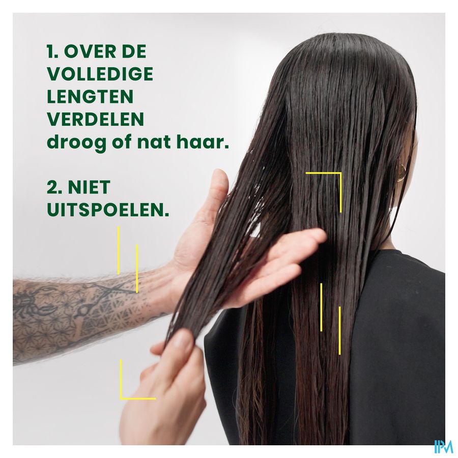 Een dotje product over de (handdoek)droge lengten verdelen. Niet uitspoelen.