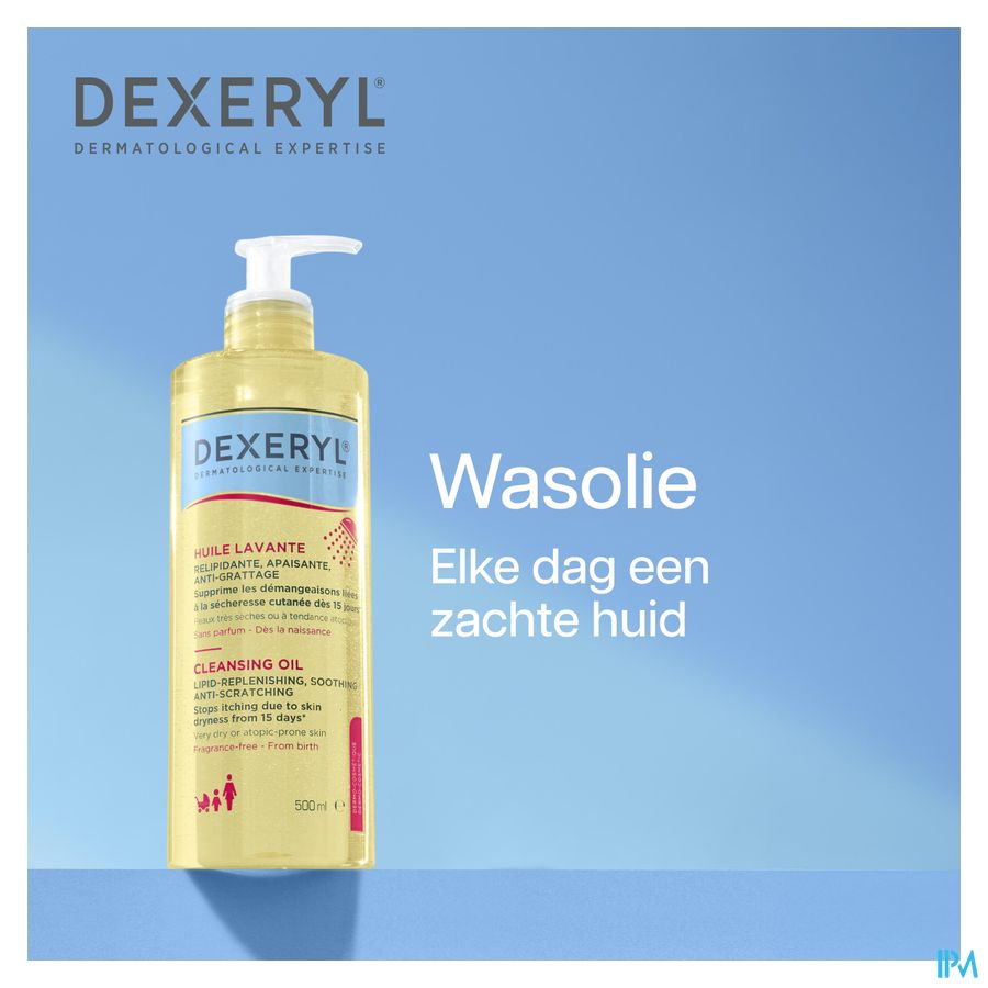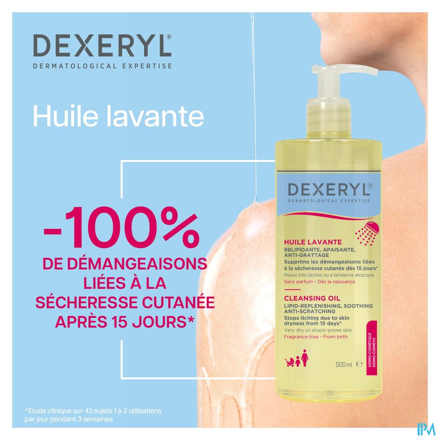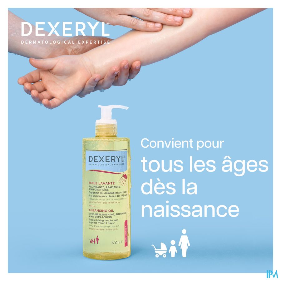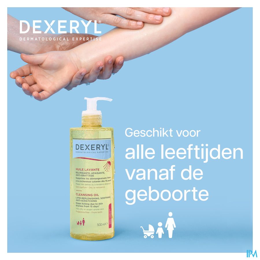 Een droge huid of huid gevoelig voor eczeem kan al snel huidirritaties vertonen bij contact met water en zeep. Dexeryl reinigende olie is speciaal ontwikkeld voor de droge tot zeer droge huid en de huid gevoelig voor eczeem. De formule reinigt de huid op milde wijze, oefent een huidkalmerende en lipidenherstellende werking uit zonder de huidbarrière uit balans te brengen. De jeuk is na 15 dagen gebruik¹ met 100% verminderd. Geschikt voor de huid van het hele gezin. De formule zonder zeep en parfum is geschikt voor gebruik bij baby's vanaf de geboorte. De vloeibare textuur is gemakkelijk aan te brengen en omhult de huid met een aangenaam luchtig en zacht schuim, dat gemakkelijk weer af te spoelen is.