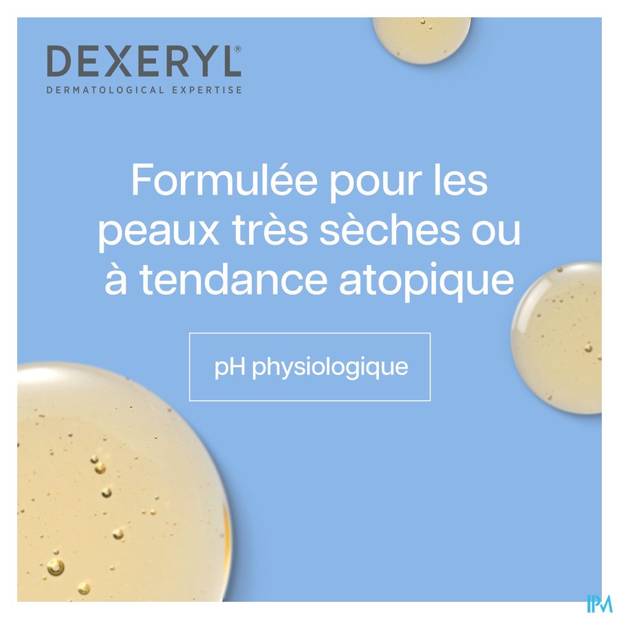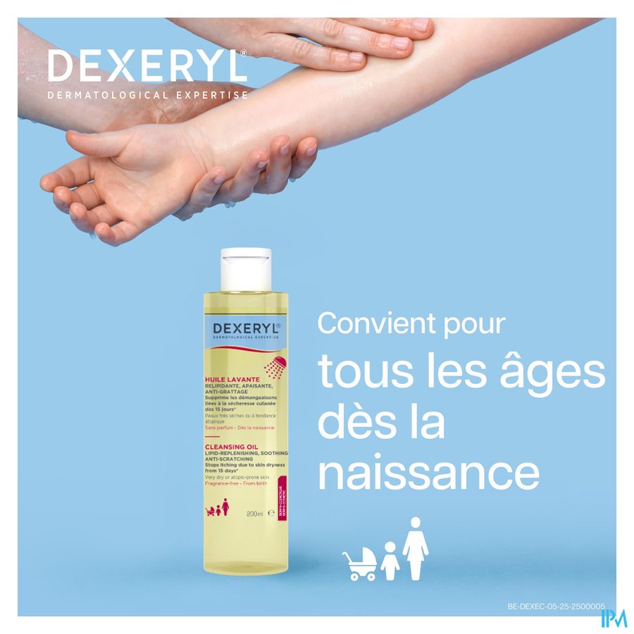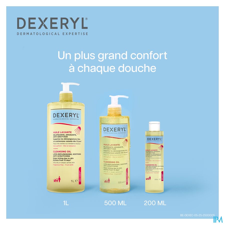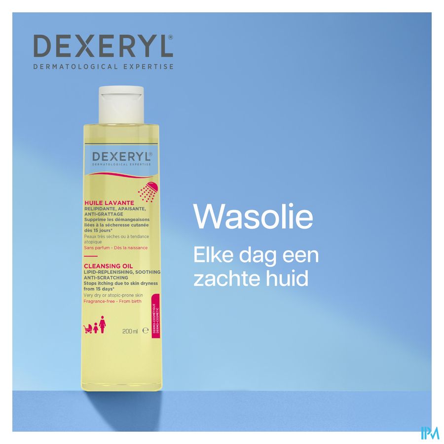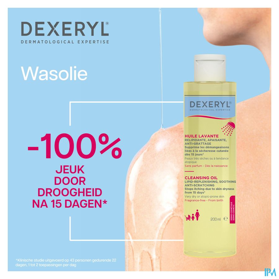 Een droge huid of huid gevoelig voor eczeem kan al snel huidirritaties vertonen bij contact met water en zeep. Dexeryl reinigende olie is speciaal ontwikkeld voor de droge tot zeer droge huid en de huid gevoelig voor eczeem. De formule reinigt de huid op milde wijze, oefent een huidkalmerende en lipidenherstellende werking uit zonder de huidbarrière uit balans te brengen. De jeuk is na 15 dagen gebruik¹ met 100% verminderd. Geschikt voor de huid van het hele gezin. De formule zonder zeep en parfum is geschikt voor gebruik bij baby's vanaf de geboorte. De vloeibare textuur is gemakkelijk aan te brengen en omhult de huid met een aangenaam luchtig en zacht schuim, dat gemakkelijk weer af te spoelen is.