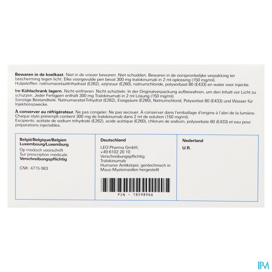 Elke voorgevulde pen bevat 300 mg tralokinumab in 2 ml oplossing (150 mg/ml).
