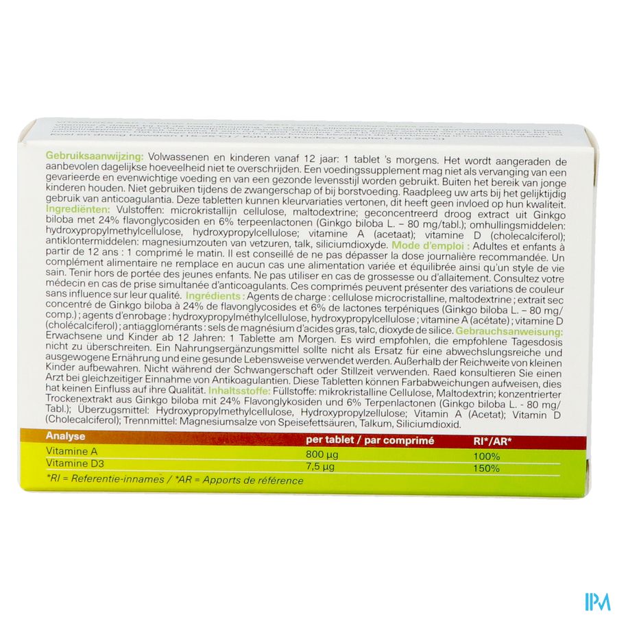 Vulstoffen: microkristallijn cellulose, maltodextrine; geconcentreerd droog extract uit Ginkgo biloba met 24% flavonglycosiden en 6% terpeenlactonen (Gingko biloba L. - 80mg/tabl.); omhullingsmiddelen: hydroxypropylmethylcellulose, hydroxypropylcellulose; vitamine A (acetaat); vitamine D (cholecalciferol); antiklontermiddelen: magnesiumstearaat, talk, siliciumdioxyde.