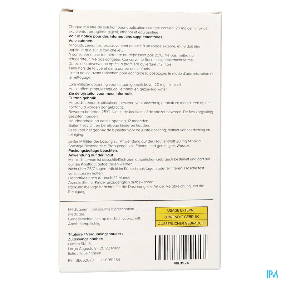 Minoxidil Leman is een oplossing voor gebruik op de huid die de werkzame stof minoxidil bevat voor de behandeling van klachten van haarverlies als gevolg van mannelijke hormonen (androgeen haarverlies) bij mannen en vrouwen tussen 18 en 55 jaar oud.