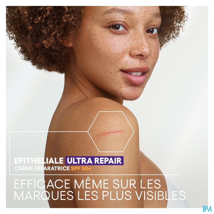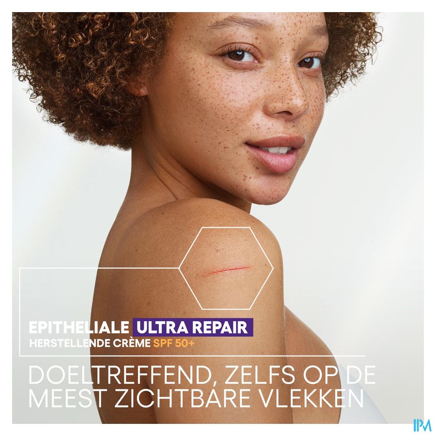 EPITHELIALE ULTRA REPAIR SPF50+ 2-in-1 herstellende crème helpt de beschadigde huid te herstellen* en biedt een zeer hoge SPF50+ zonnebescherming, met een dubbele werking tegen littekens en pigmentvlekken. Deze herstellende crème voor gezicht en lichaam bevat een gepatenteerd** herstellend complex van 3 actieve ingrediënten genaamd Cicahyalumide®, bestaande uit dipeptide, hyaluronzuur en Rhealba® haverextract. Het bevat ook Kattenklauw voor zijn ultrakalmerende eigenschappen. En om een optimale tolerantie tijdens het gebruik te garanderen, bevat het fotoprotectieve systeem slechts 4 filters in een geoptimaliseerde concentratie. Deze herstellende crème voor de beschadigde huid is ideaal om de huid dagelijks te kalmeren en te beschermen. Hij is parfumvrij en geschikt voor zowel volwassenen als kinderen, en kan meerdere keren per dag worden aangebracht op het gezicht en lichaam. Rhealba® Haver van biologische landbouw Veganistische info: geen ingrediënten van dierlijke oorsprong