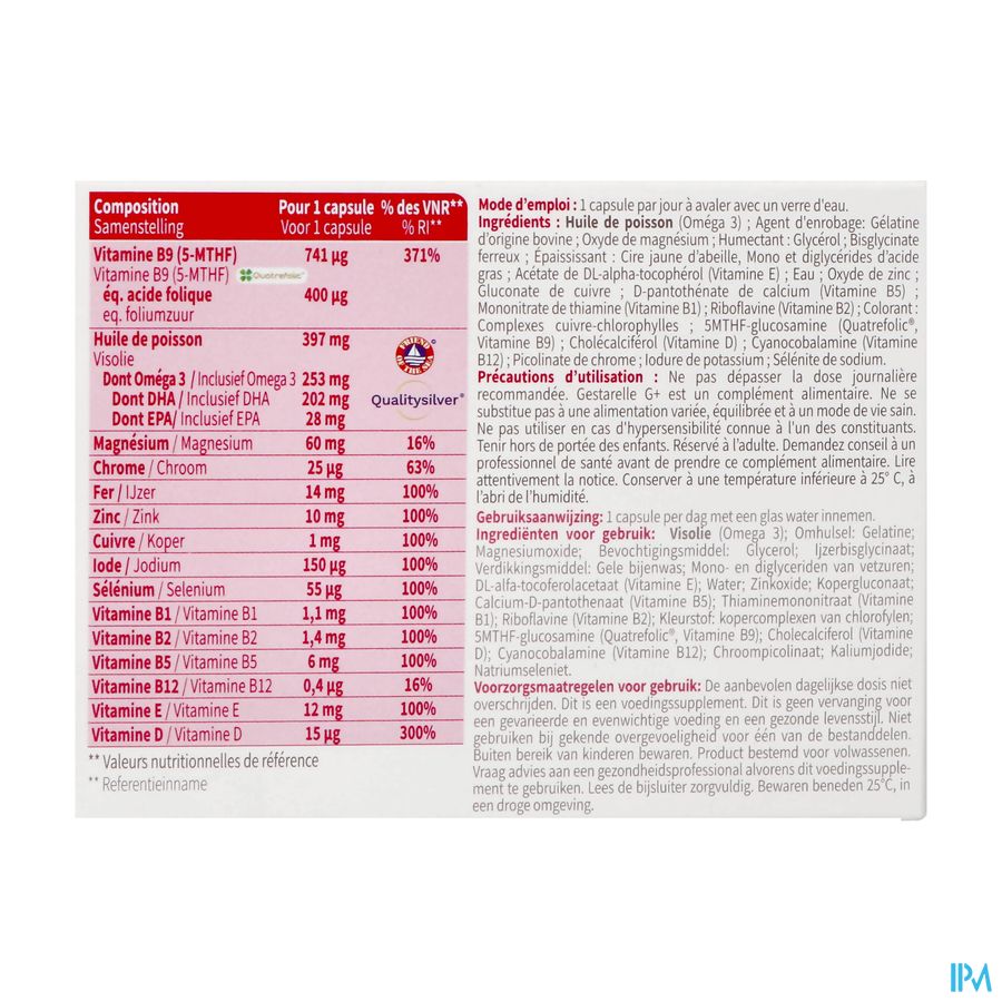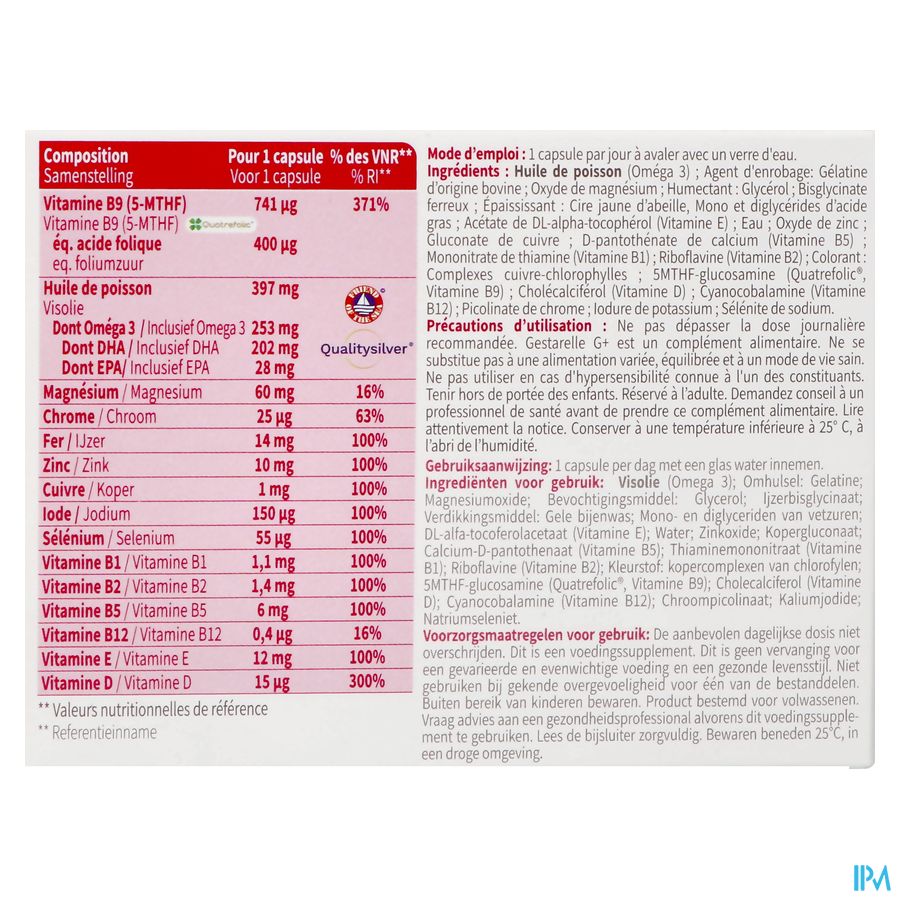 Met één capsule per dag levert Gestarelle G + ook vele andere essentiële elementen, zoals vetzuren (gezuiverde en gestabiliseerde Omega 3 uit visolie), jodium, ijzer en vitamines.